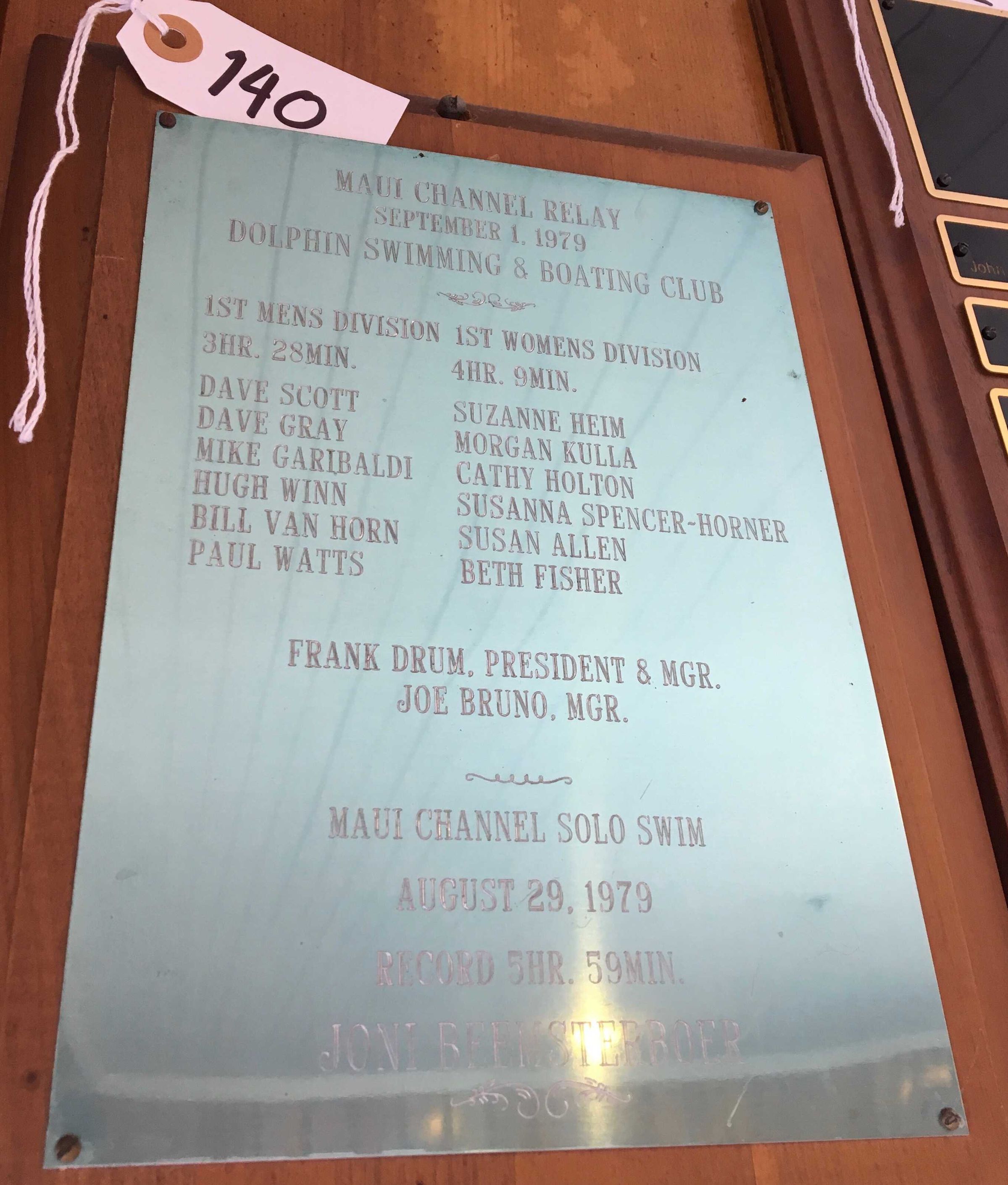 Text on top of plate: "Maui Channel Relay - September 1, 1979 - Dolphin Swimming & Boating Club - 1st Mens Division - 1st Women's Division, under each title is overall time of each team and names of team members.