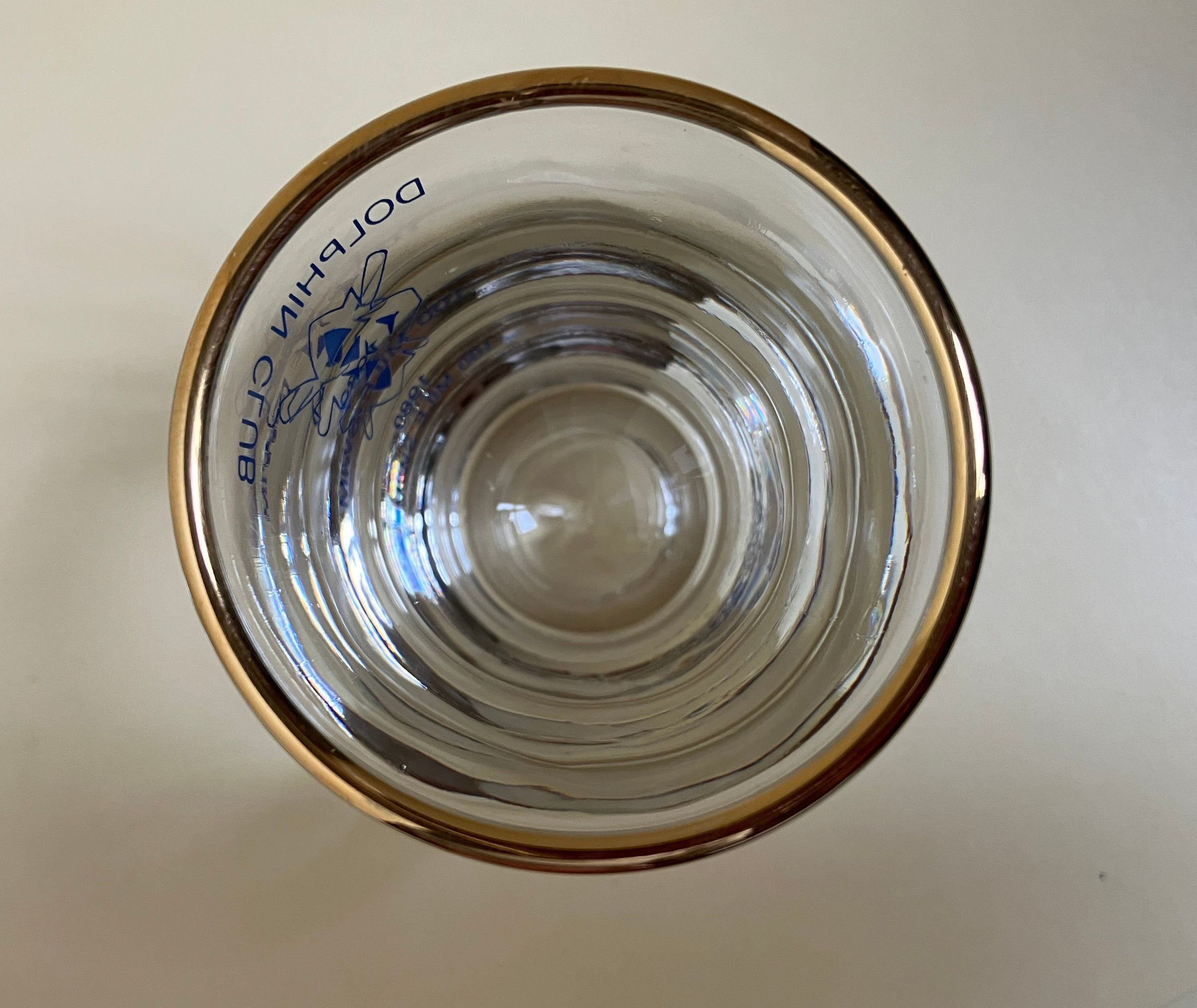 Shot glass, gold rim. Text in blue on one side: Dolphin Club - outlined crossed oars logo - 1989 - 100 Mile Swim