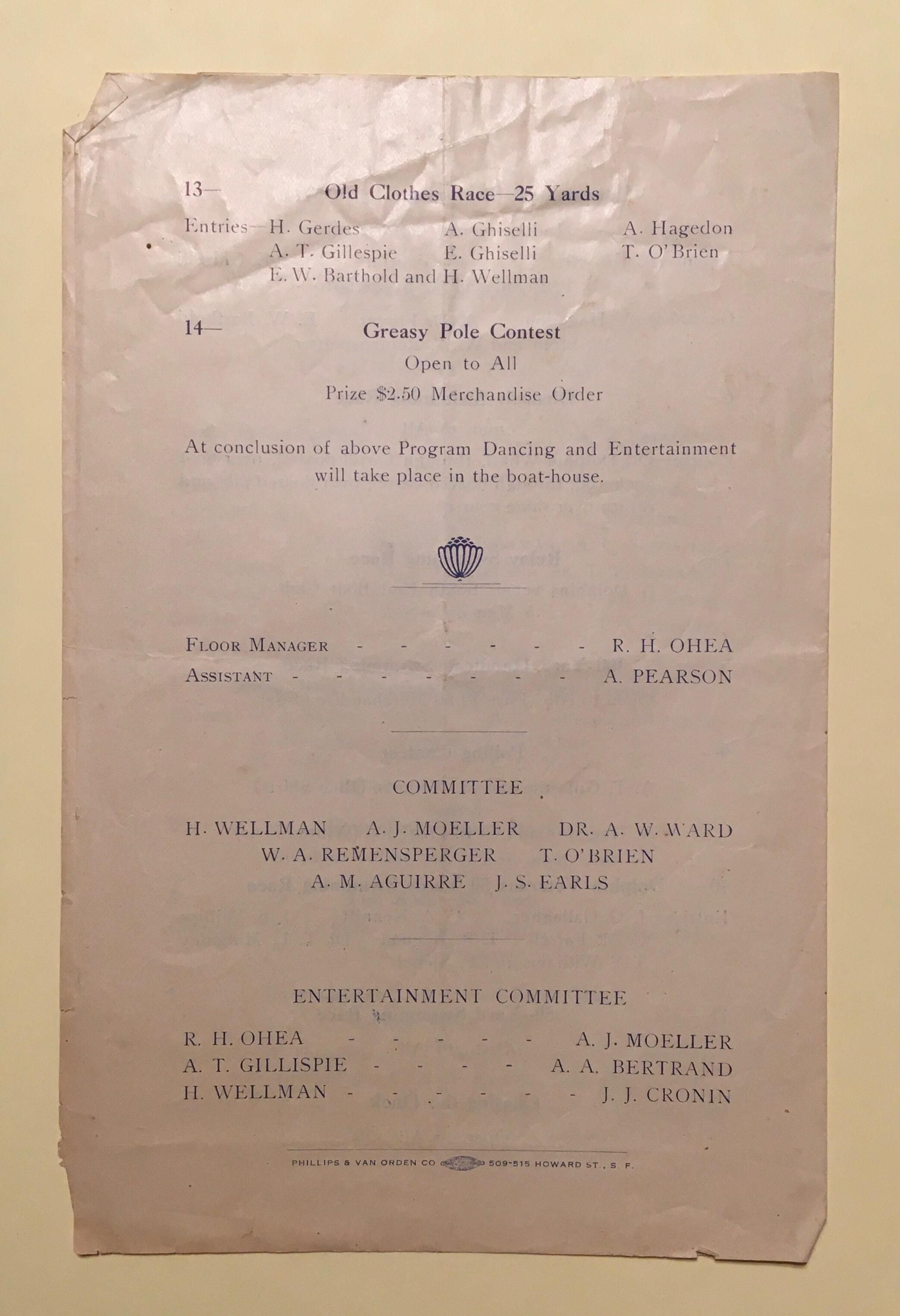 Inside: Officials for the races, list of rowing races and names of rowers, several swimming races including obstacle race, polling race, and chasing the duck. Relay swim race is DSBC vs SERC.