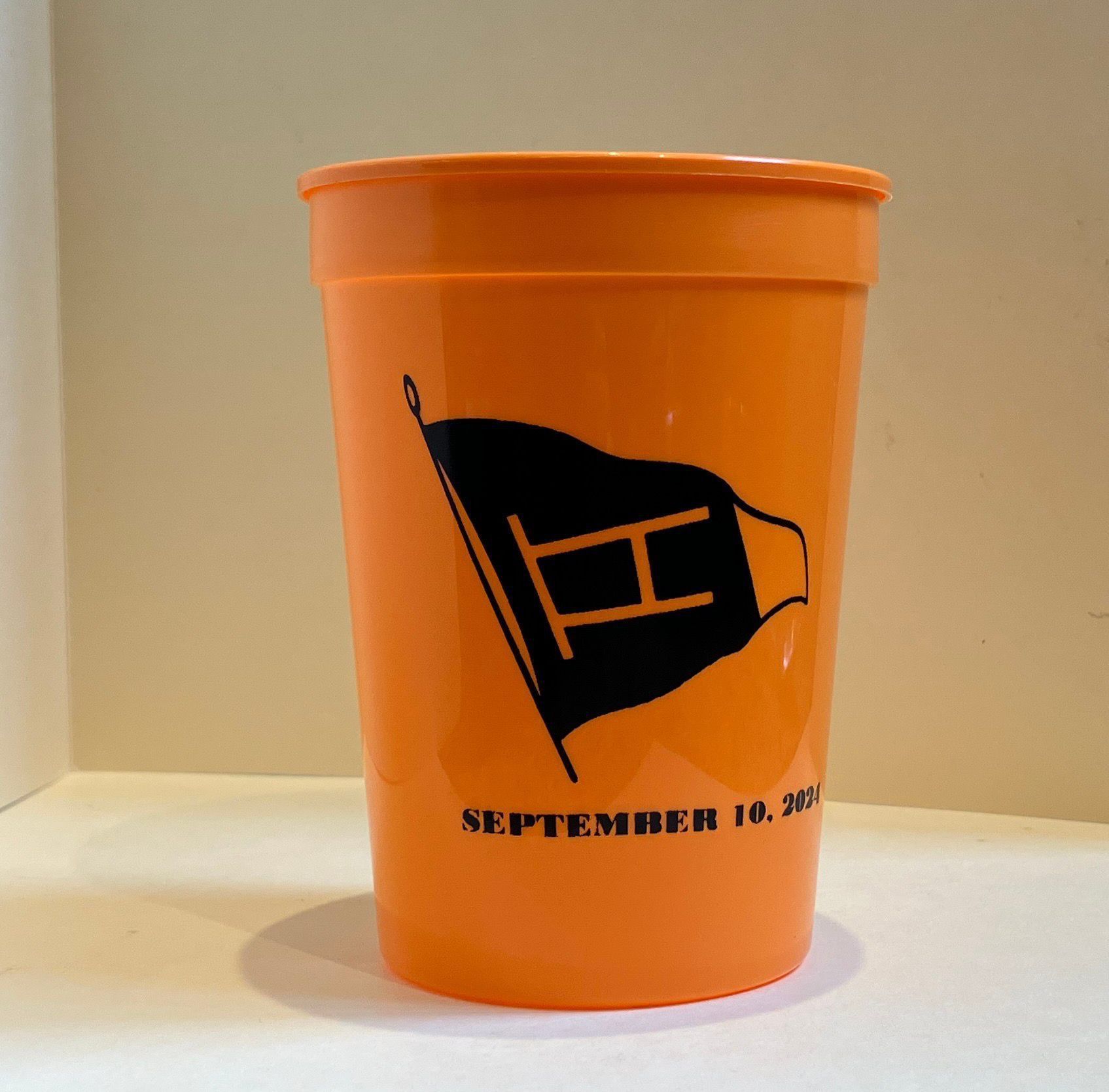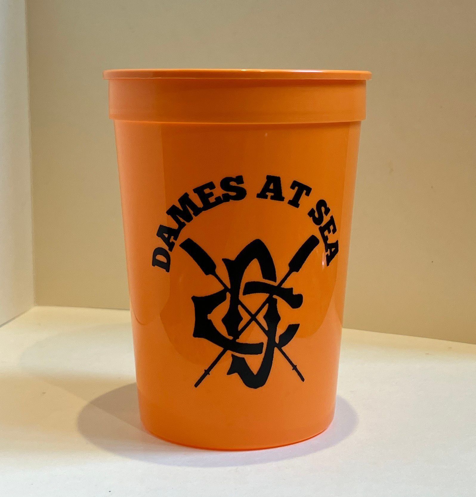 Black printed crossed oars DC logo and "Dames at Sea" on front, yacht burgee 3/4 black field with horizontal design, and 1/4 blue field. Date underneath. plastic cup with black printing.