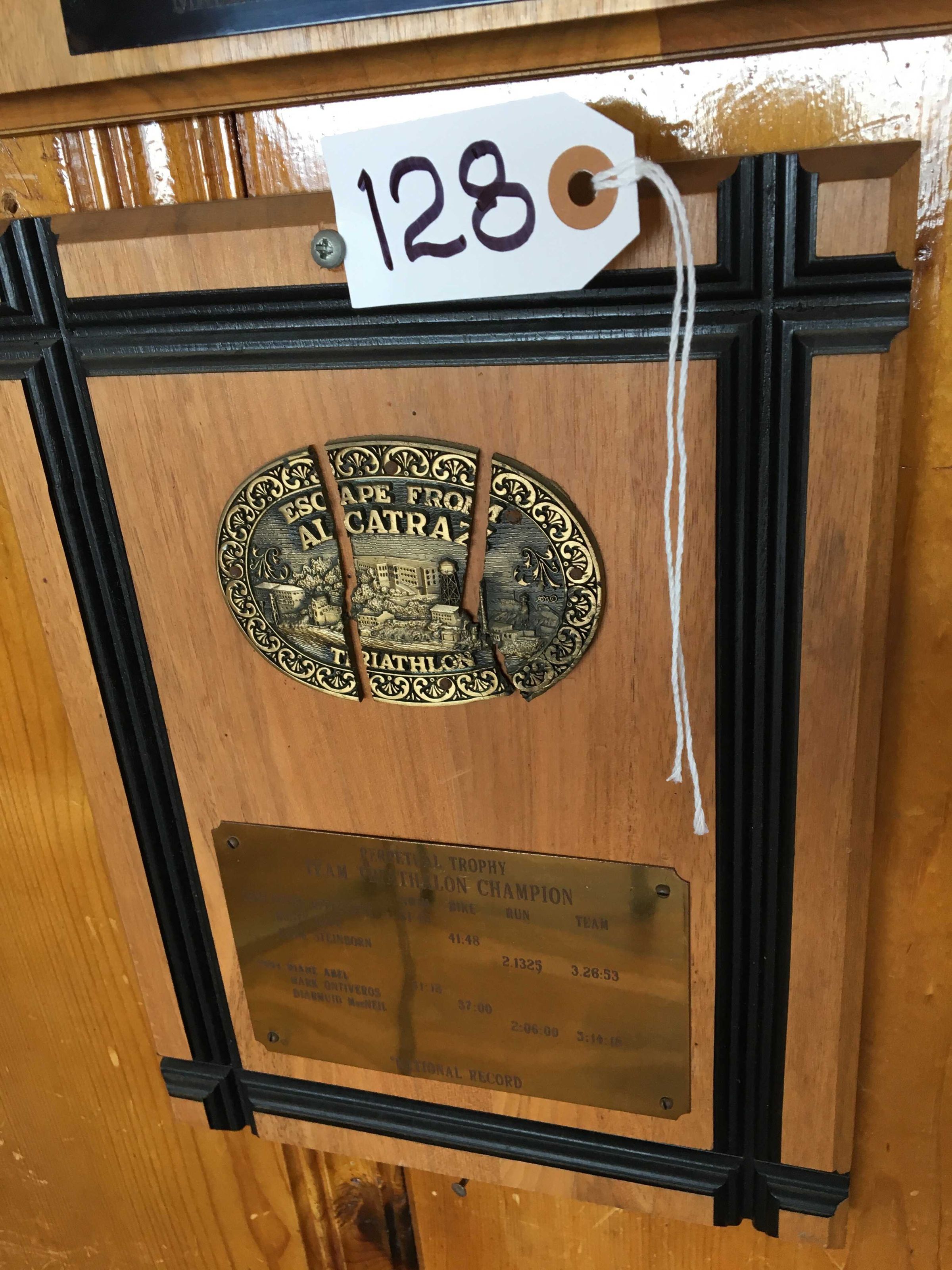 Text on plate: “Perpetual Trophy - Team Triathlon Champion" and “National Record” with two teams and time listed between.