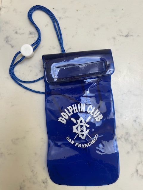 Dark blue plastic mobile phone waterproof pouch. Opening folds several times then has a velcro seal. Blue cord with white plastic slider connector.