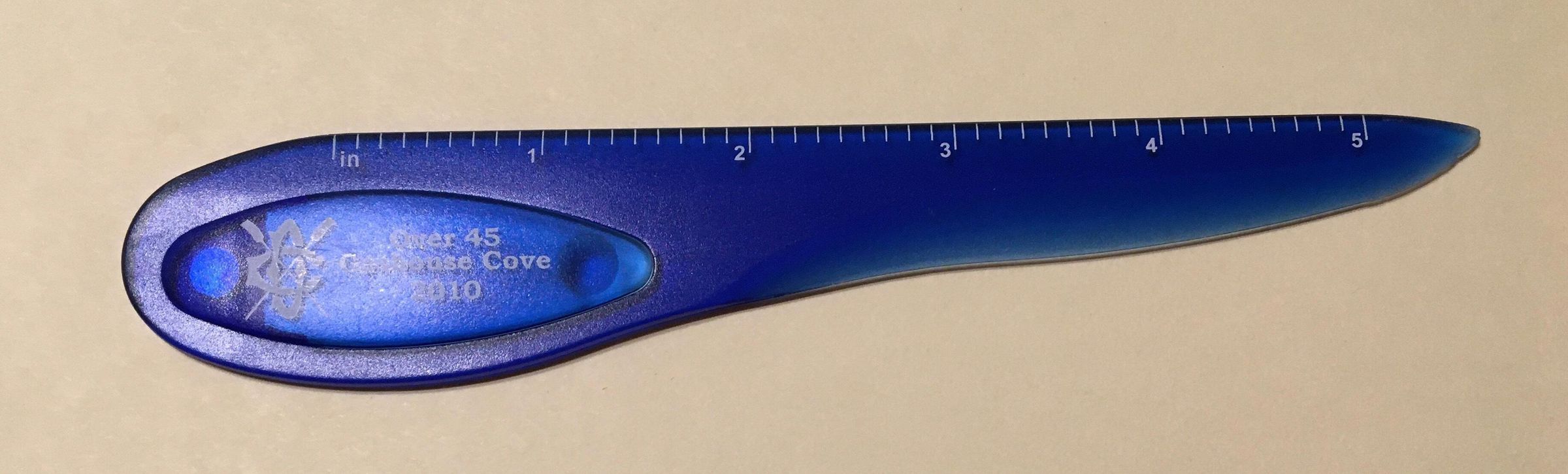 Blue clear plastic tool, handle at one end, "blade" extends with sharper edge on bottom, and flat edge on top with markings for 5 inches. Small magnet in tip of handle.