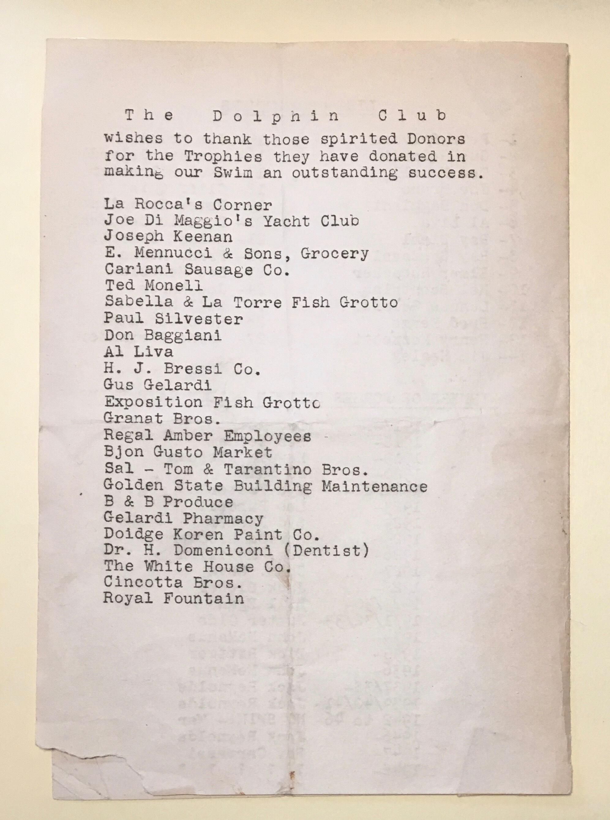 Program for Golden Gate Swim Sept 12, 1948. Program lists officials, pilots, swim commissioner, and all 27 swimmers. And past winners back to 1917.