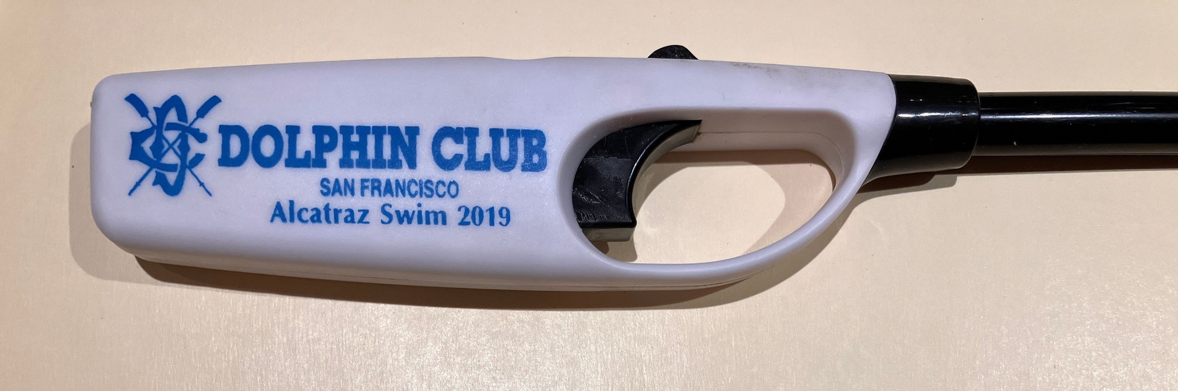 Blue text on one side: Crossed oars logo - Dolphin Club - San Franciso- Alcatraz Swim 2019