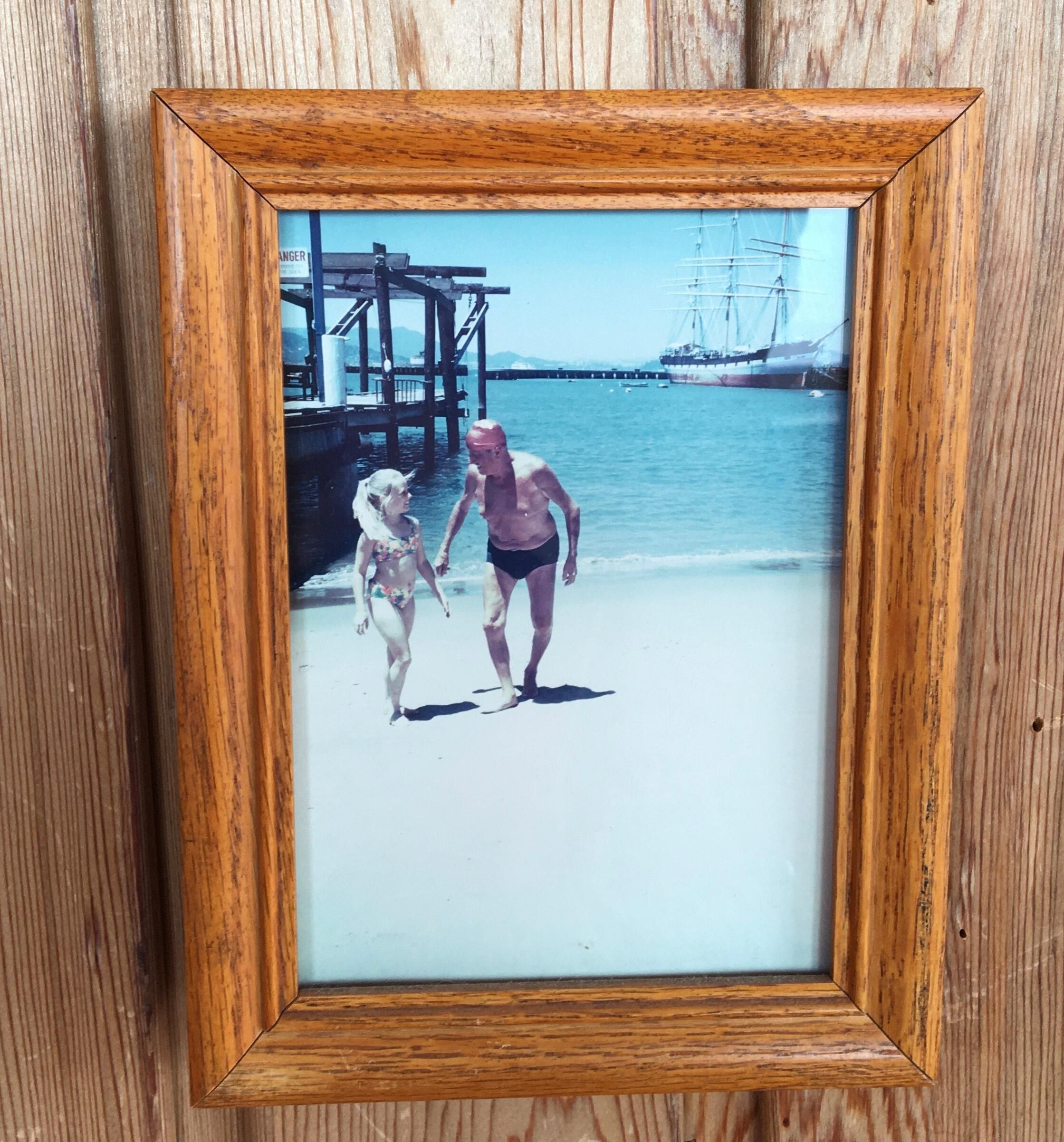 Color photo of Frank Mennucci and girl on the beach. Brown wood frame.