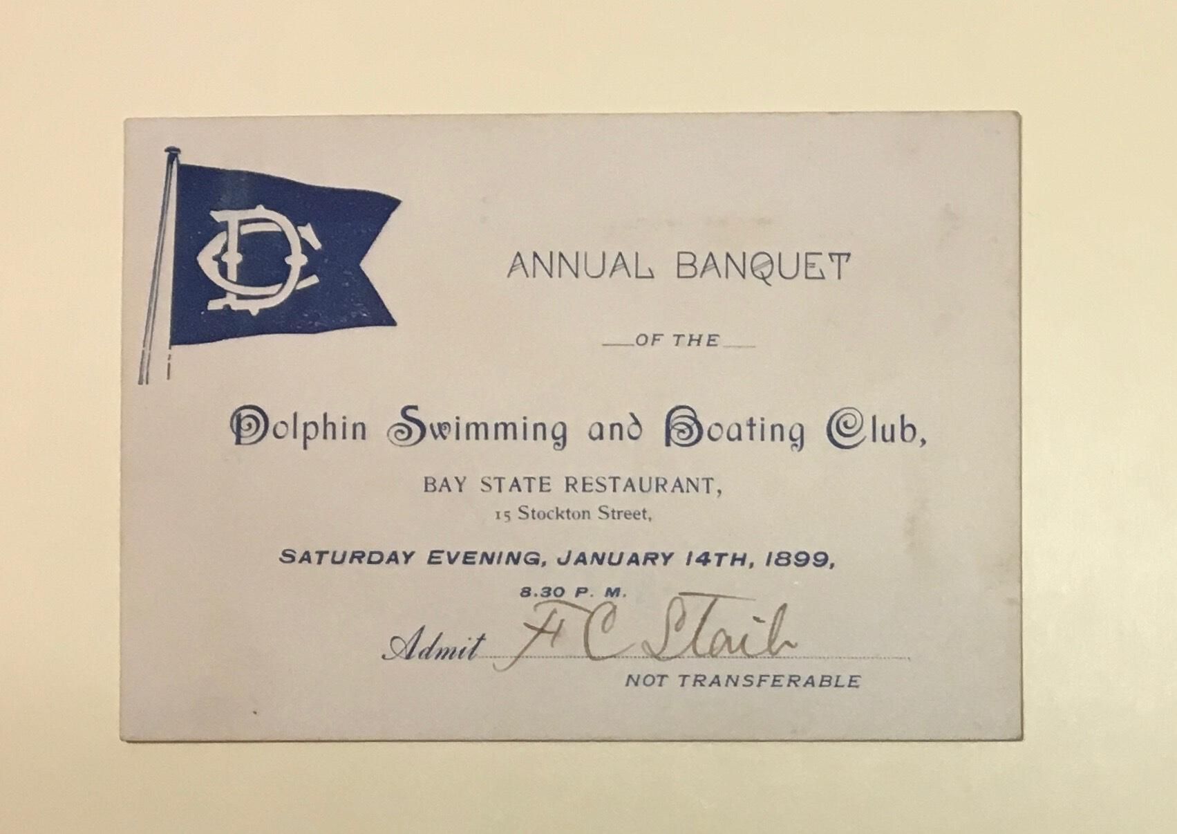 Ticket for Annual Banquet on January 14, 1899 at the Bay State Restaurant, 15 Stockton Street.