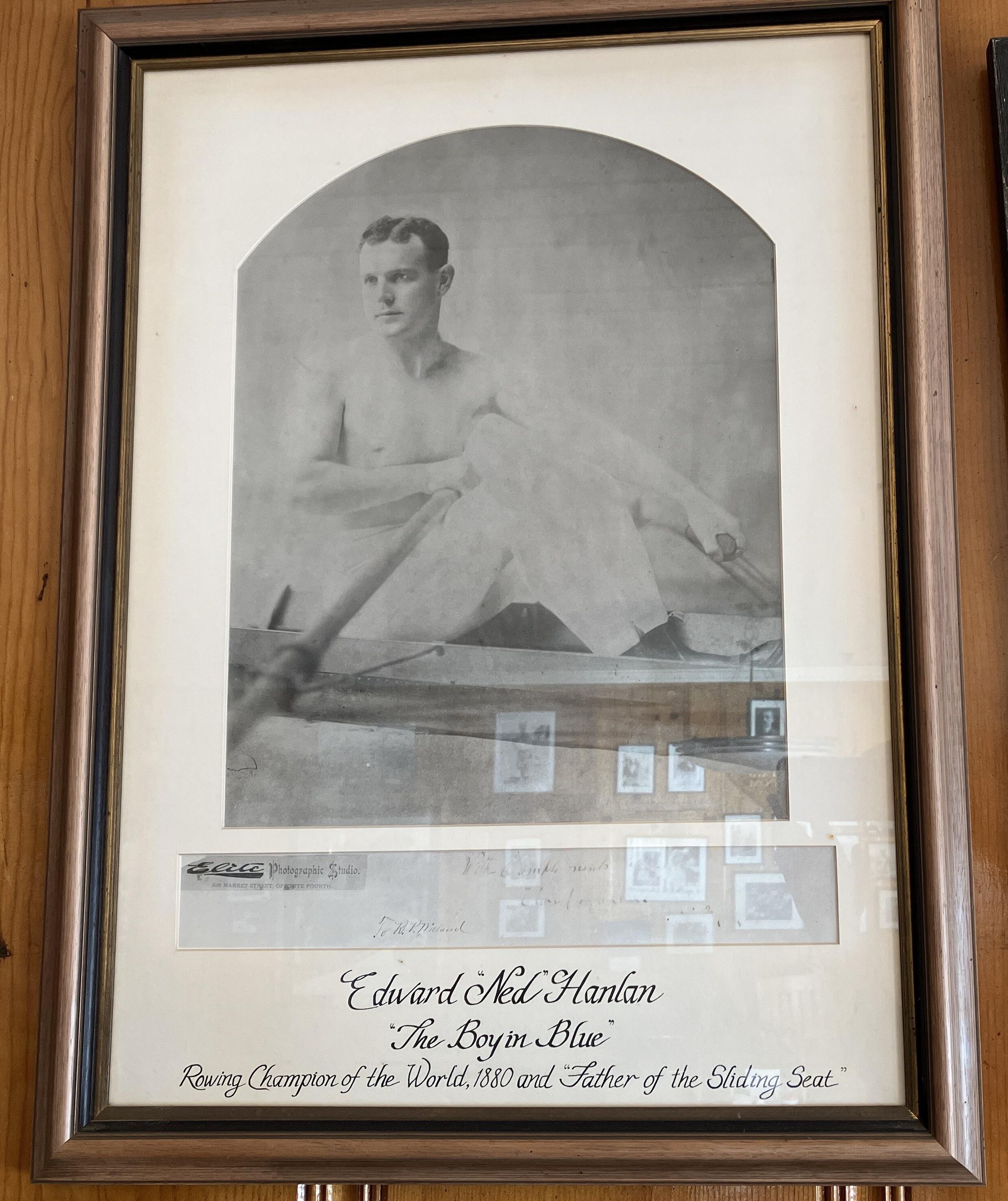 Caption on bottom in script: Edward "Ned" Hanlon - "The Boy in Blue" - Rowing Champion of the World 1880 and "Father of the Sliding Seat."