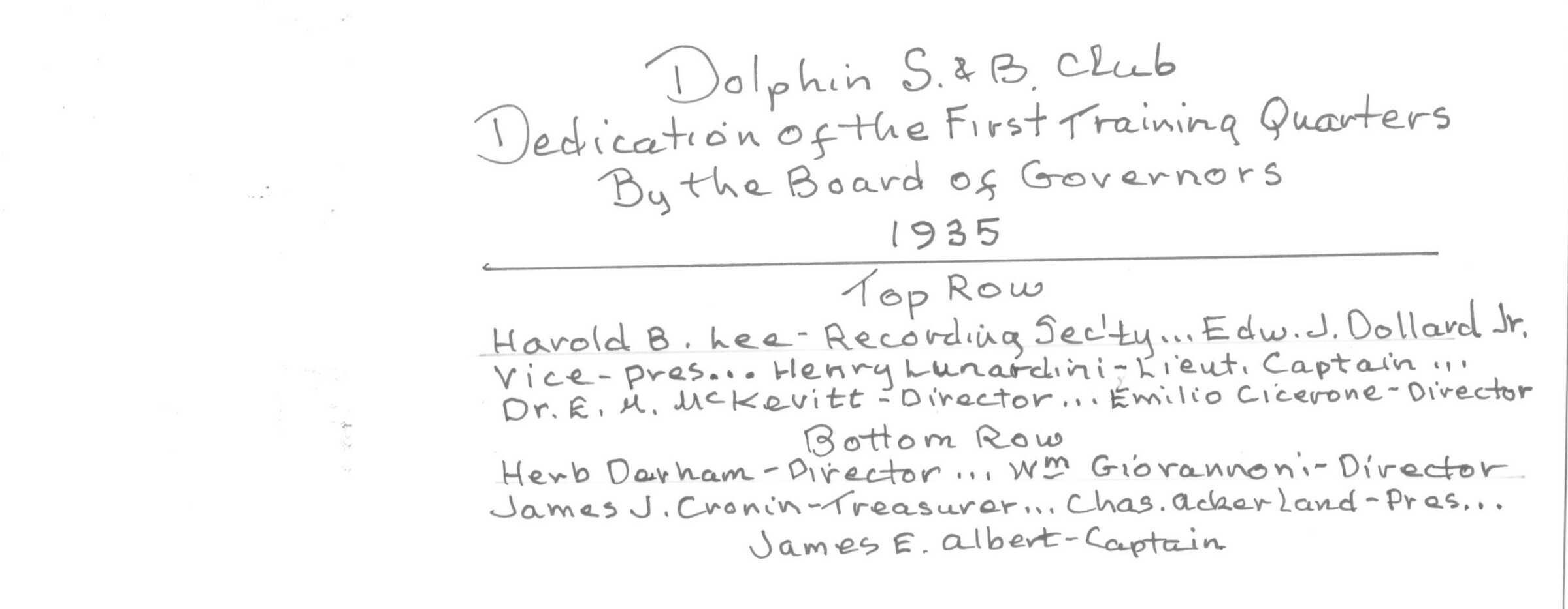 Board of Governors at dedication of training quarters in 1935 at Pier 54. In 1951 that location was taken over for a rail yard expansion. The building along with rowing training were soon relocated to Lake Merced.