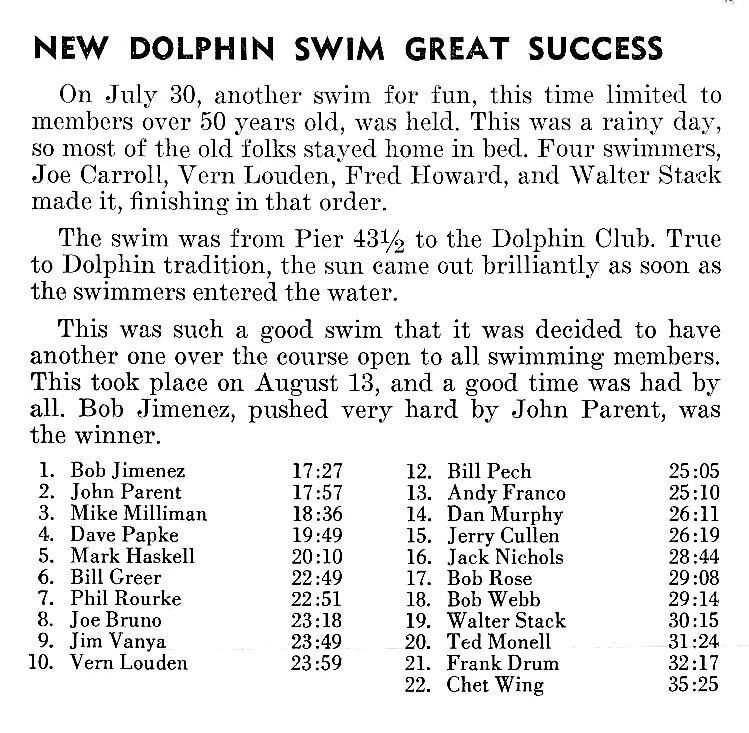 Pier 43-1/2 Swimmers L to R: Standing - Ted Monell, Chet Wing, Andy Franco, Joe Bruno, Jim Vanya, Walt Stack, unknown, Jack Nichols, Frank Drum, Mike Milliman, John Parent, Jerry Cullen, Dan Murphy, Mark Haskell, Bob Jimenez. Seated - Bob Rose, Vern Louden, Phil Rourke, Bill Greer, Bill Pech, Dave Papke, Bob Webb.Subject Person or Organization