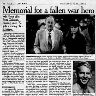 Steven Cuthbert joined the Dolphin Club in July 1962 and was a top swimmer. He became an Air Force pilot during the Vietnam war and went missing in action in 1972. This article reports the return of his remains and the memorial service in 1991.