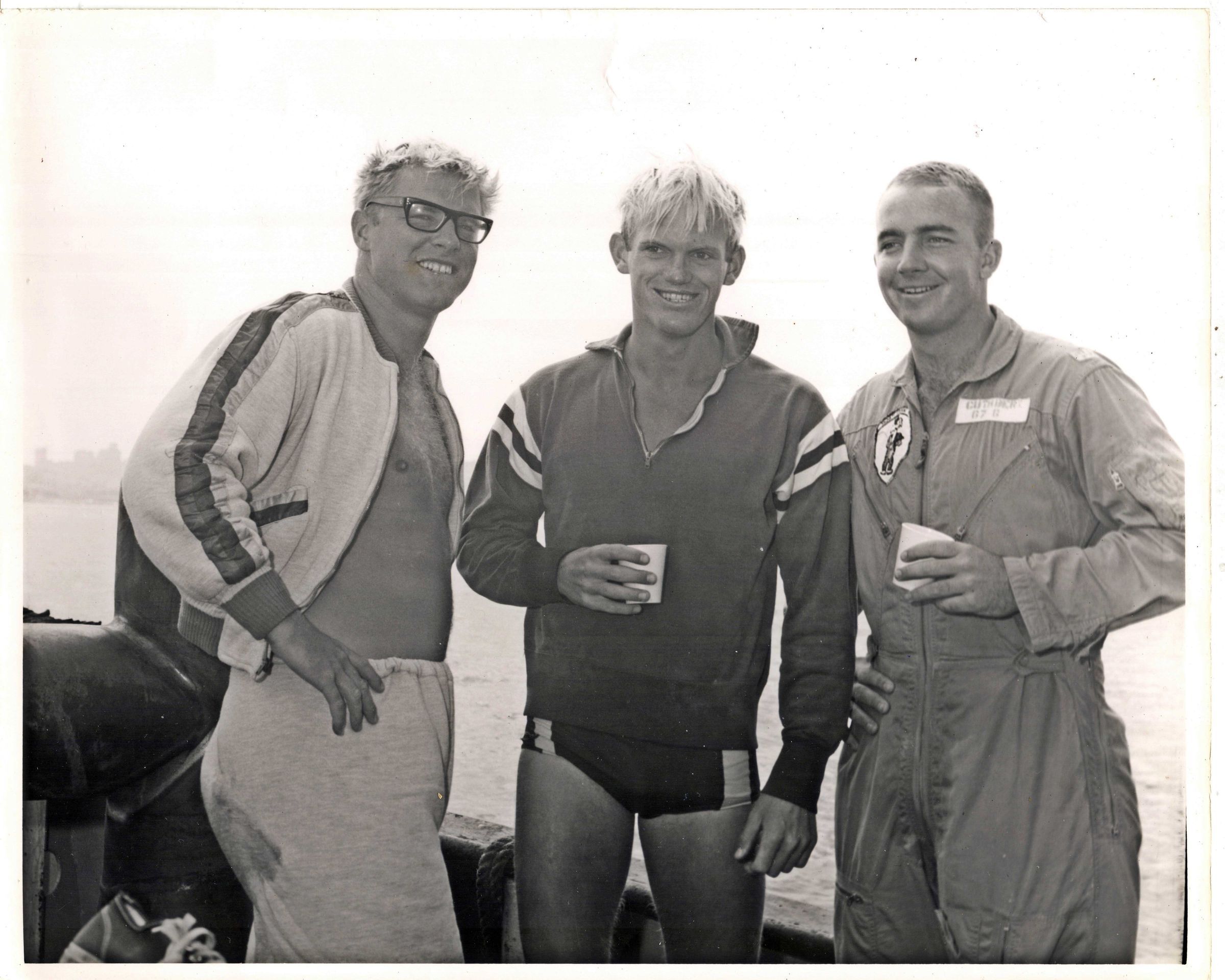 Three happy swimmers getting warm