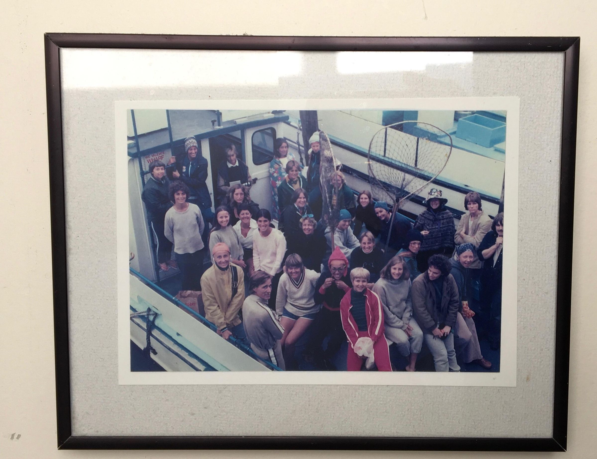 Color photograph of women on back of fishing boat; tan mat, black metal frame and glass.