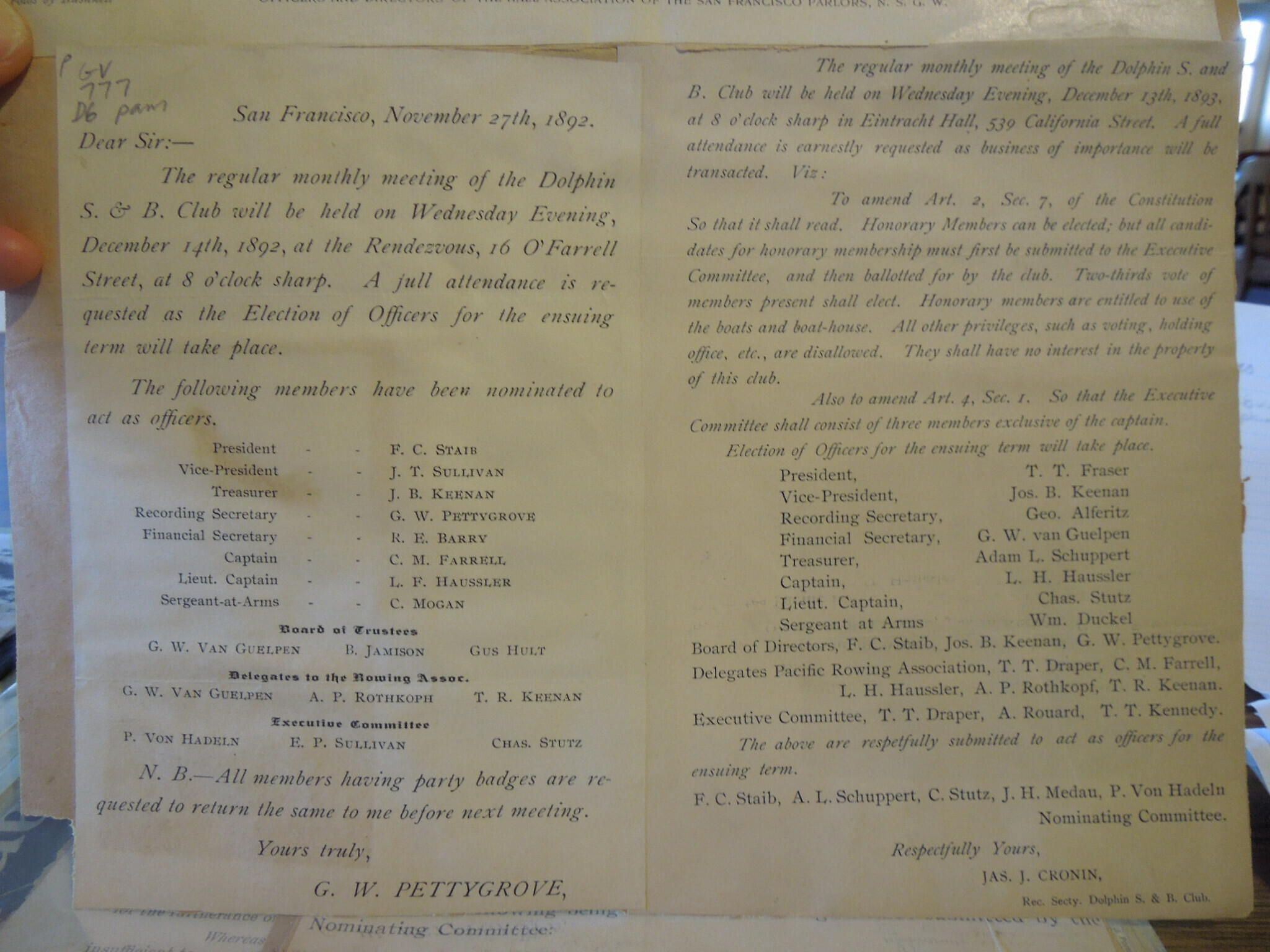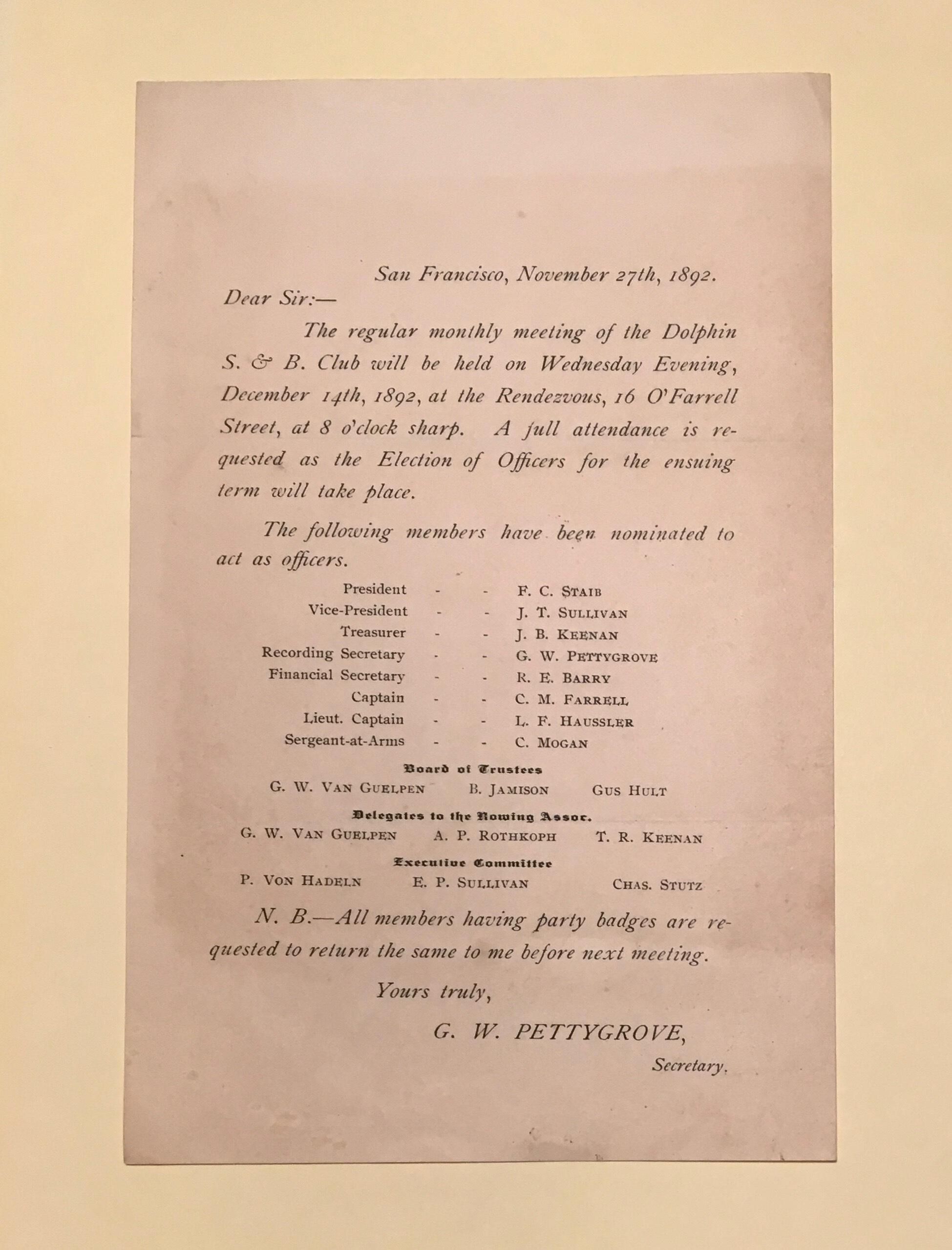 States, "meeting will be held on Wednesday Evening, December 14th, 1892, at the Rendezvous, 16 O'Farrell Street, at 8 o'clock sharp."
