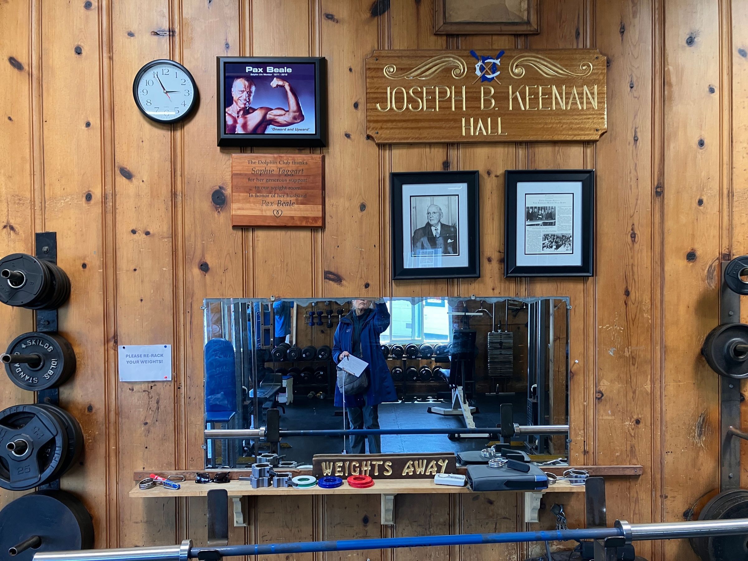 Light brown natural stained wood plaque in appreciation of financial support for weigh room from life member Sophie Taggart in memory of her husband Pax Beale, also a life member at the time of his death in 2016.