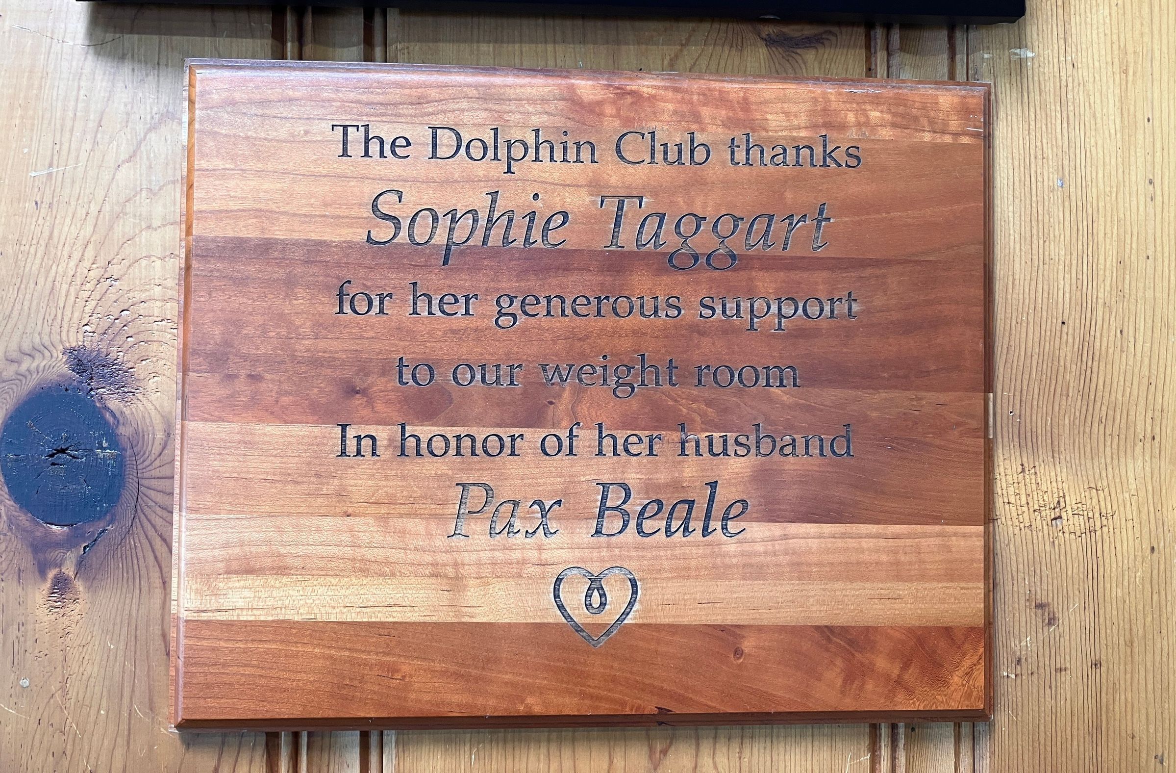 Black engraved text: The Dolphin Cub thanks - Sophie Taggart - for her generous support - to our weight room- In honor of her husband - Pax Beale - heart drawingDimensions