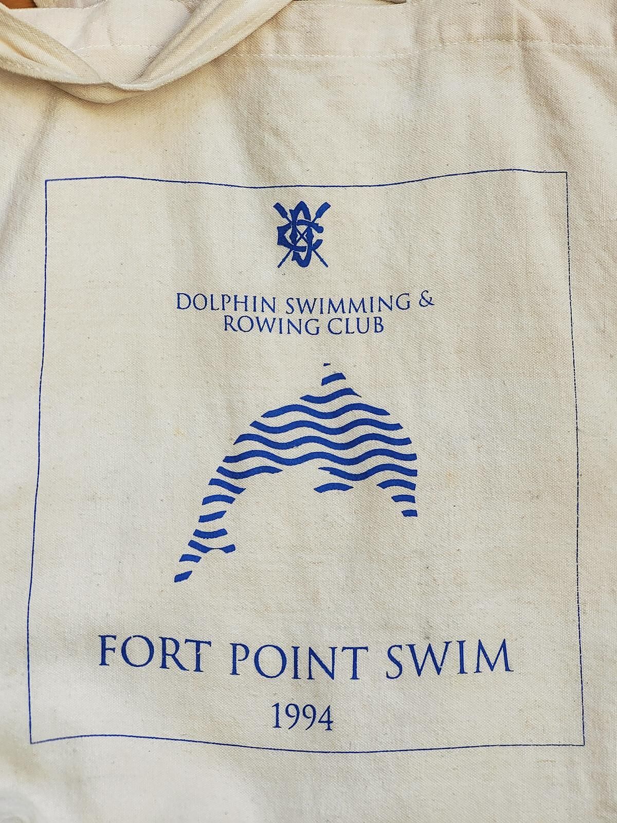 Light canvas bag in rectangular shape with navy lettering. On front in the blue letters: "Dolphin Swimming & ROWING Club - the logo - Fort Point Swim 1994."