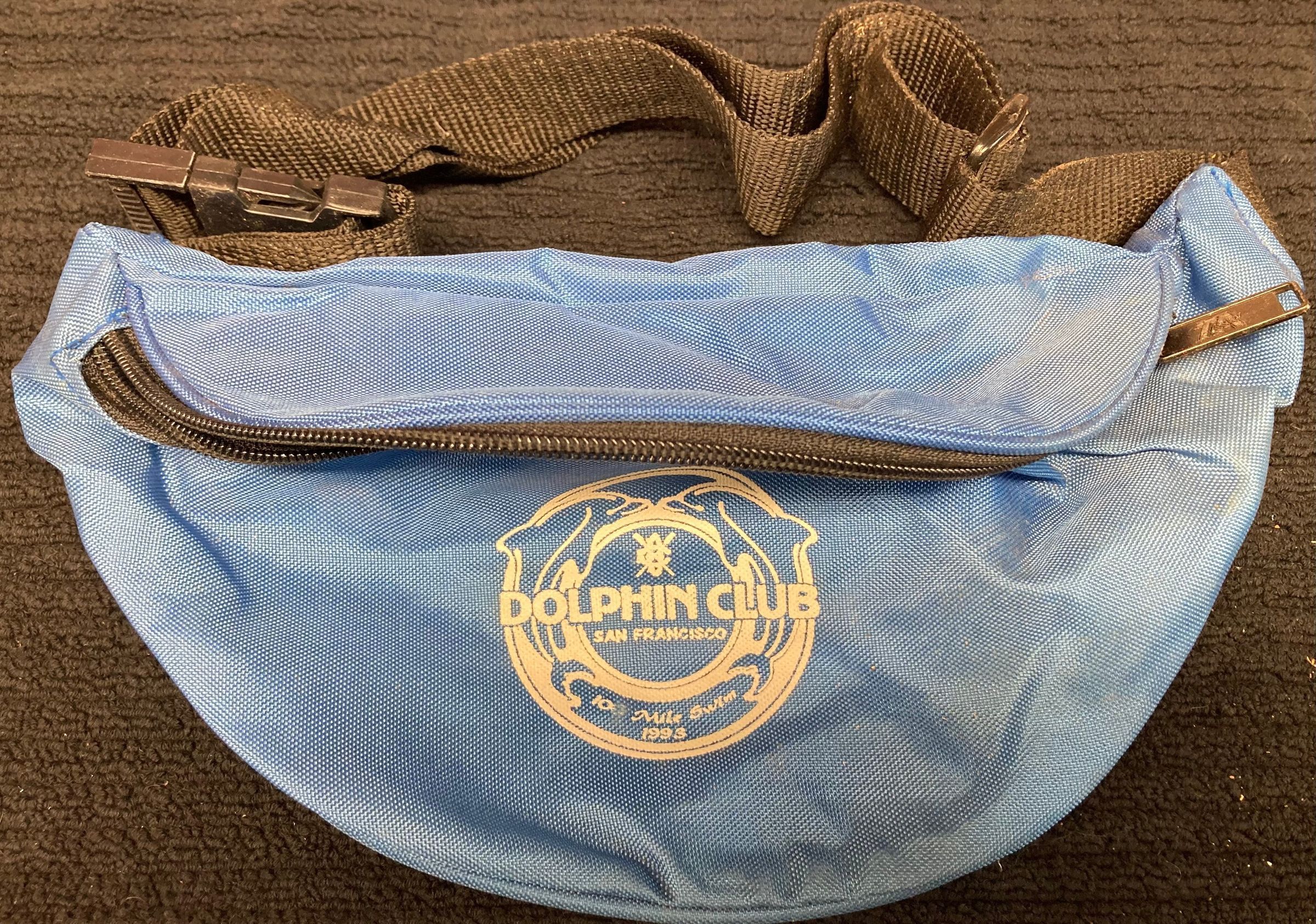 Text: Features round two dolphin logo with small crossed oar logo in center with "Dolphin Club- San Francisco" and on bottom "100 Mile Swim - 1993."Use