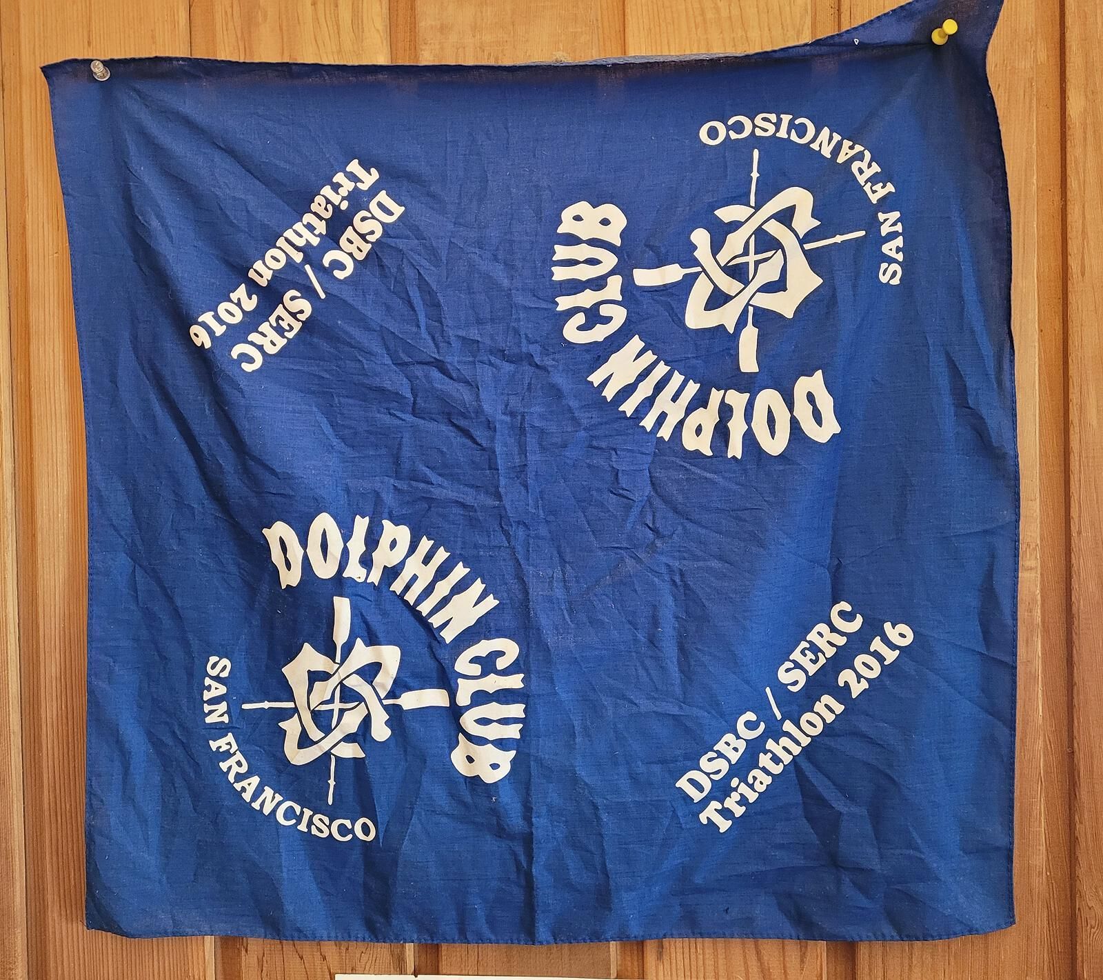 Blue bandana with white Dolphin Club name and logo on opposite corners. Made for participants in 2016 DC/SERC Triathlon.