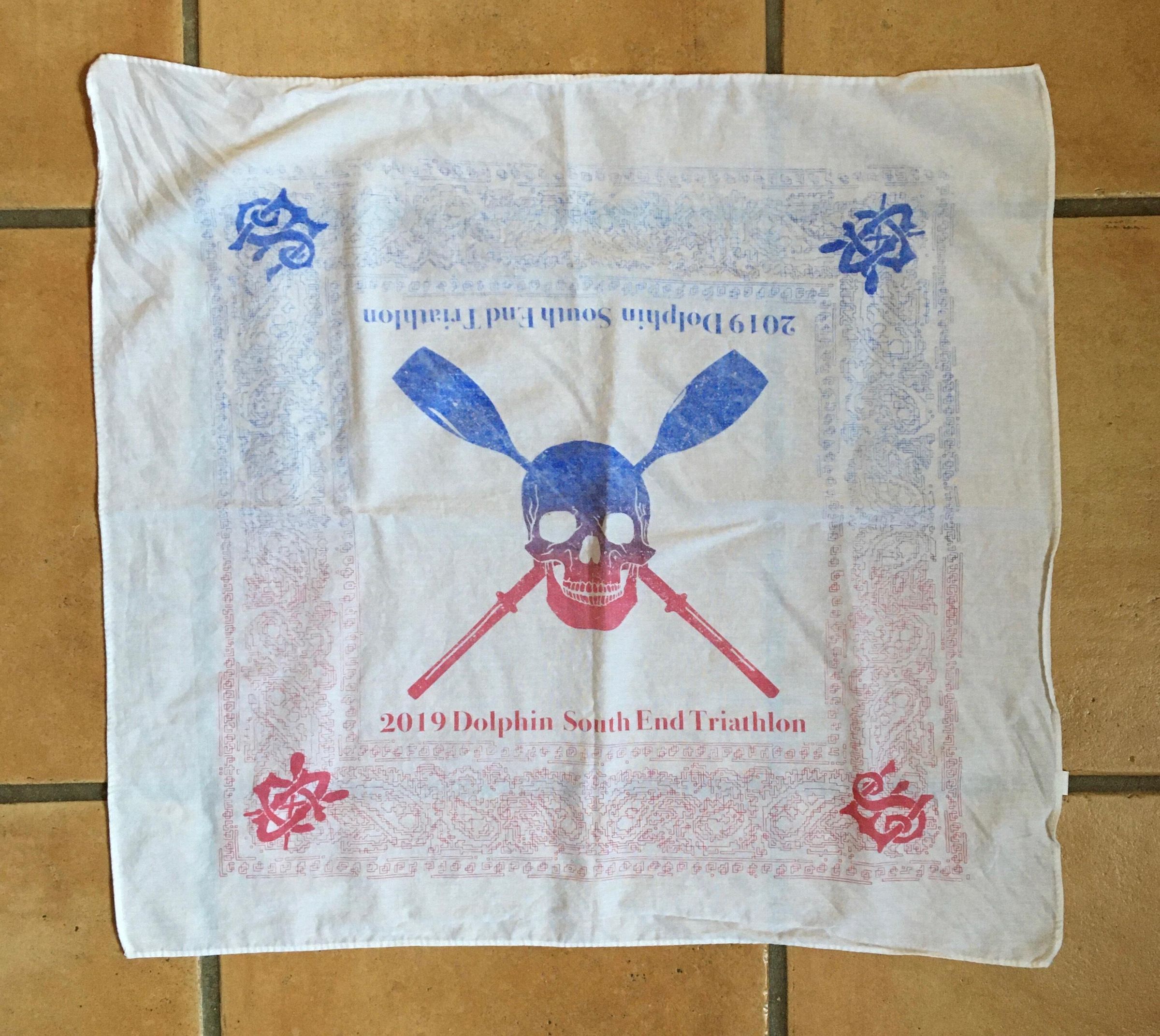 White bandana with skull over crossed oars in center. Top of bandana is pale blue fading into pale red half way down skull. Paisley style border all around with DC and SERC logos in blue on top, and in red on bottom.