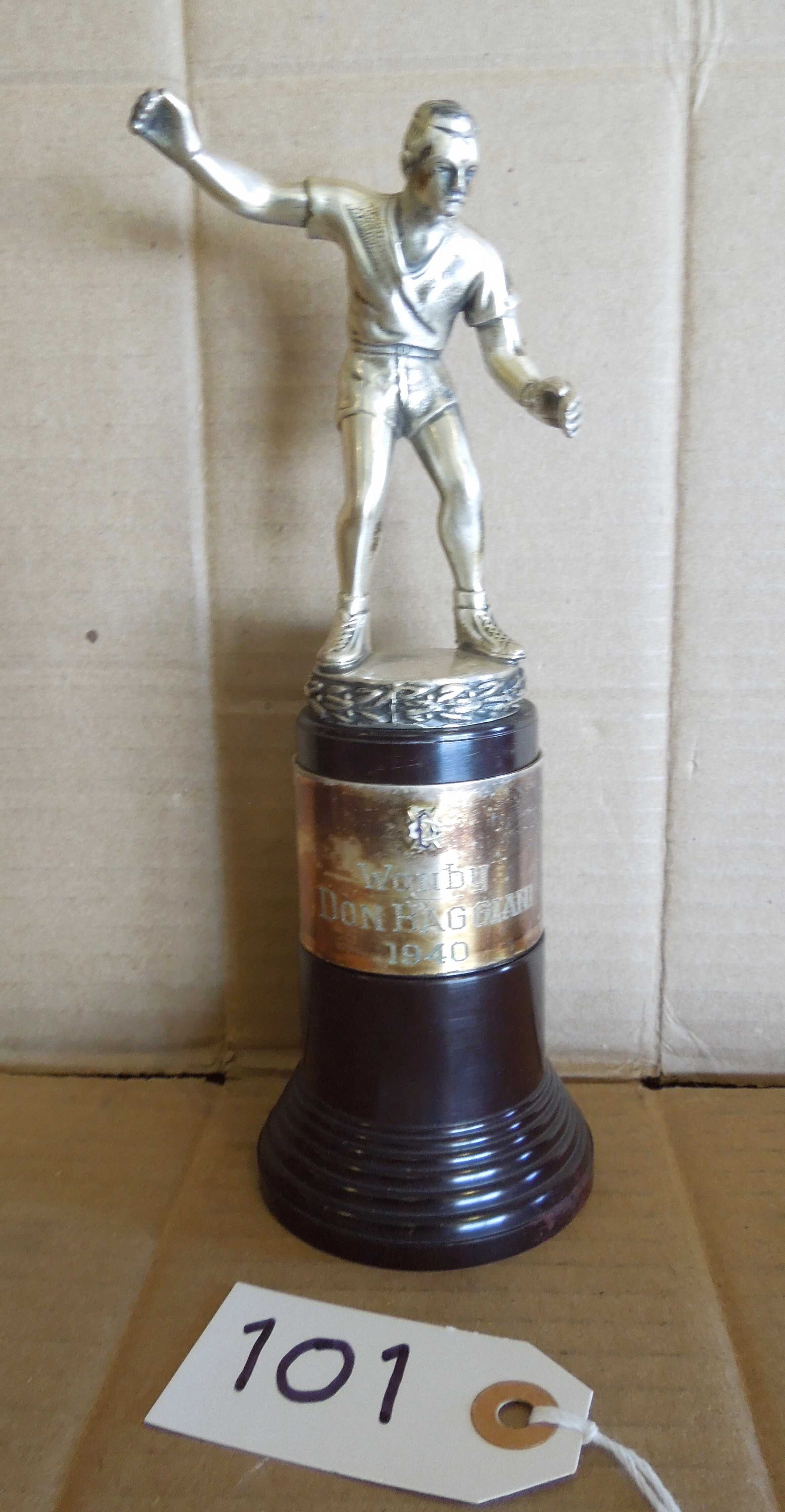 Silver colored metal handball player on cylindrical dark plastic base with metal band/plate. Engraved plate on base under small DC insignia: " Won by - Don Baggiani - 1940."