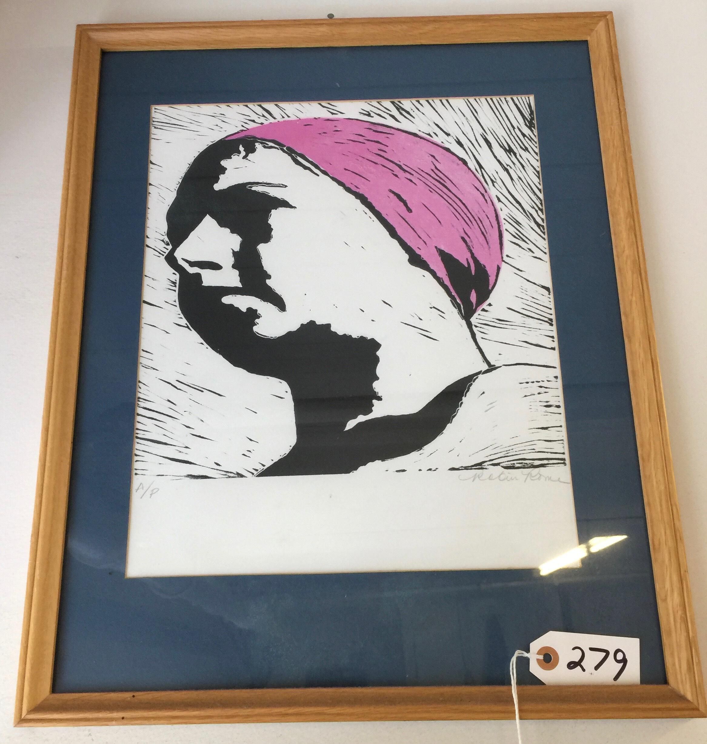 Black and white print of woman's head; she is wearing a bright pink swim cap. Dark blue mat and brown wood frame with glass. Number lower left: "A/P," signature lower right "Robin Rome."Made/Created