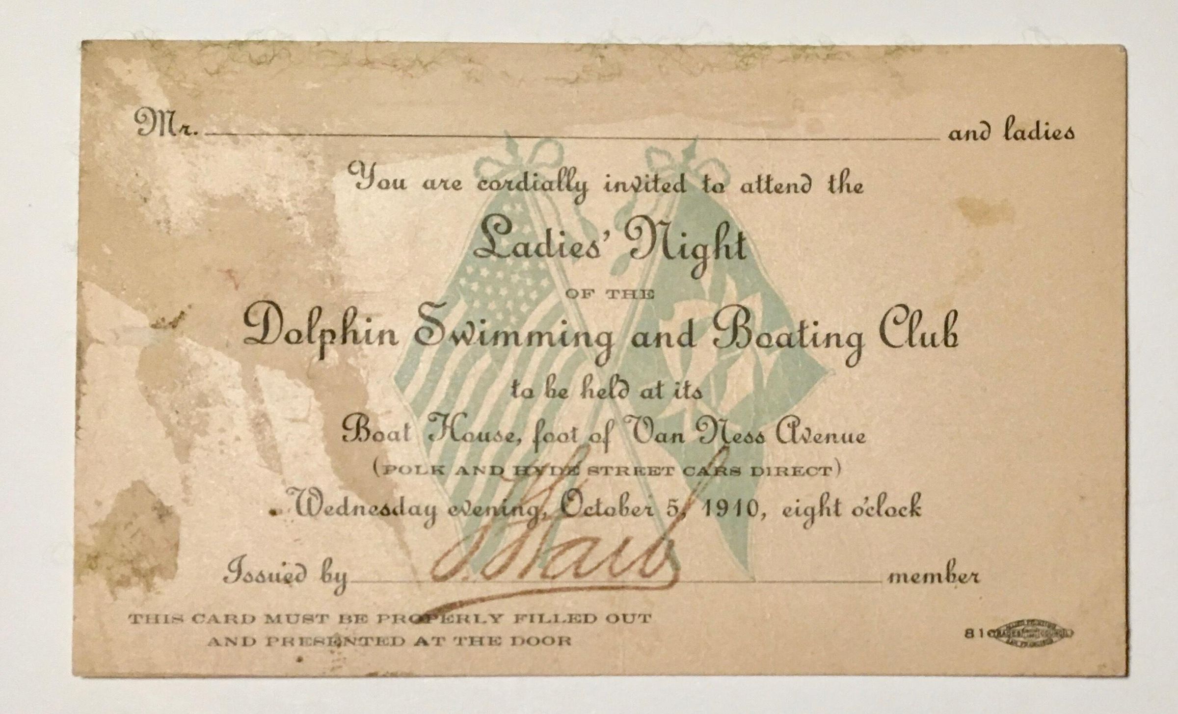Invitation Card/Ticket for Ladies Night October 5, 1010 at Dolphin Club Boat House, foot of Van Ness Ave at 8pm.