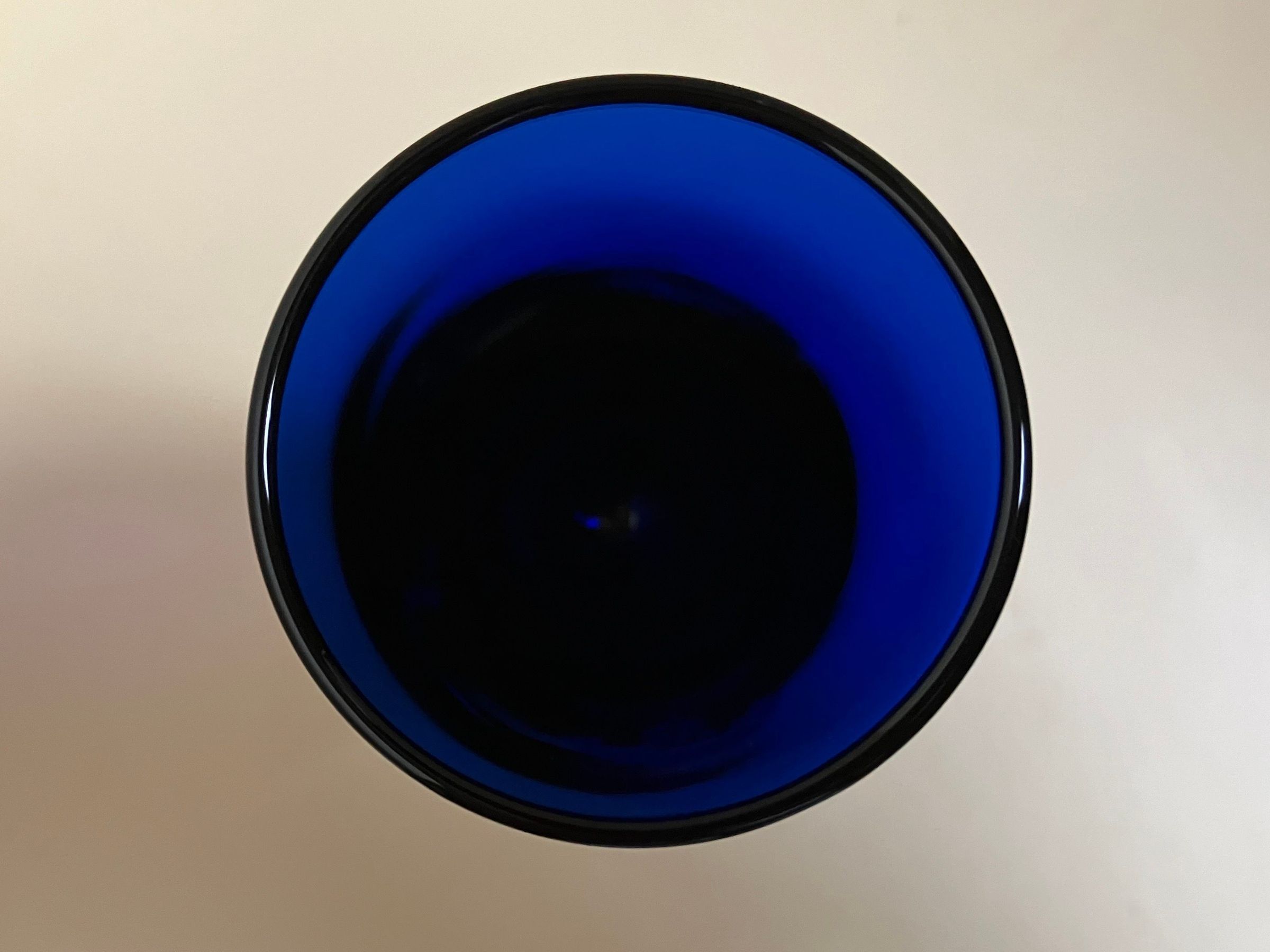Tall shot glass, royal blue color glass. Text in white on one side: Dolphin Club - crossed oars logo - San Francisco - 1999 100 Mile Swim