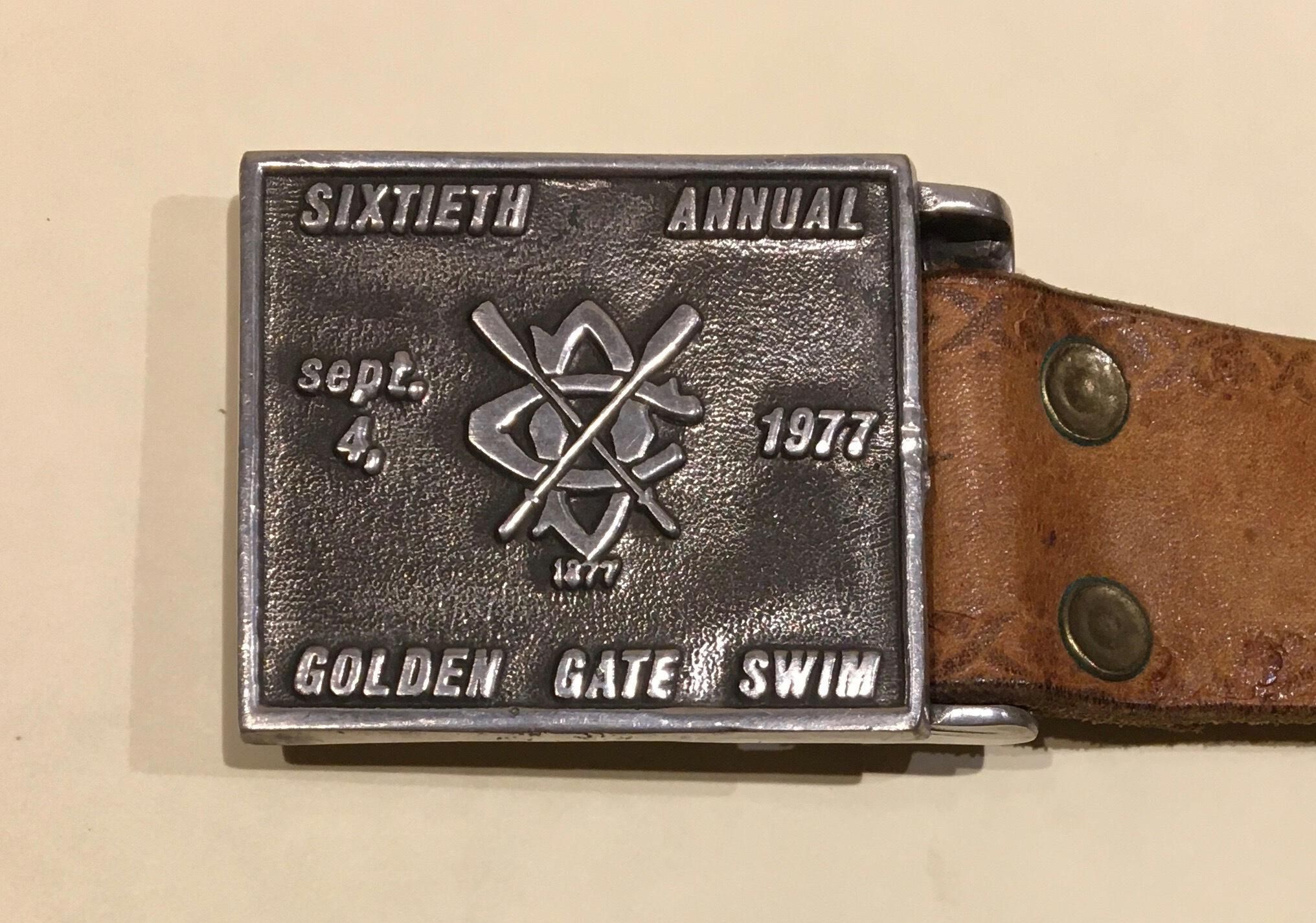 Raised text: "Sixtieth Annual - sept. 4, - DC/Crossed oar logo with 1877 under it - 1977 - Golden Gate Swim."