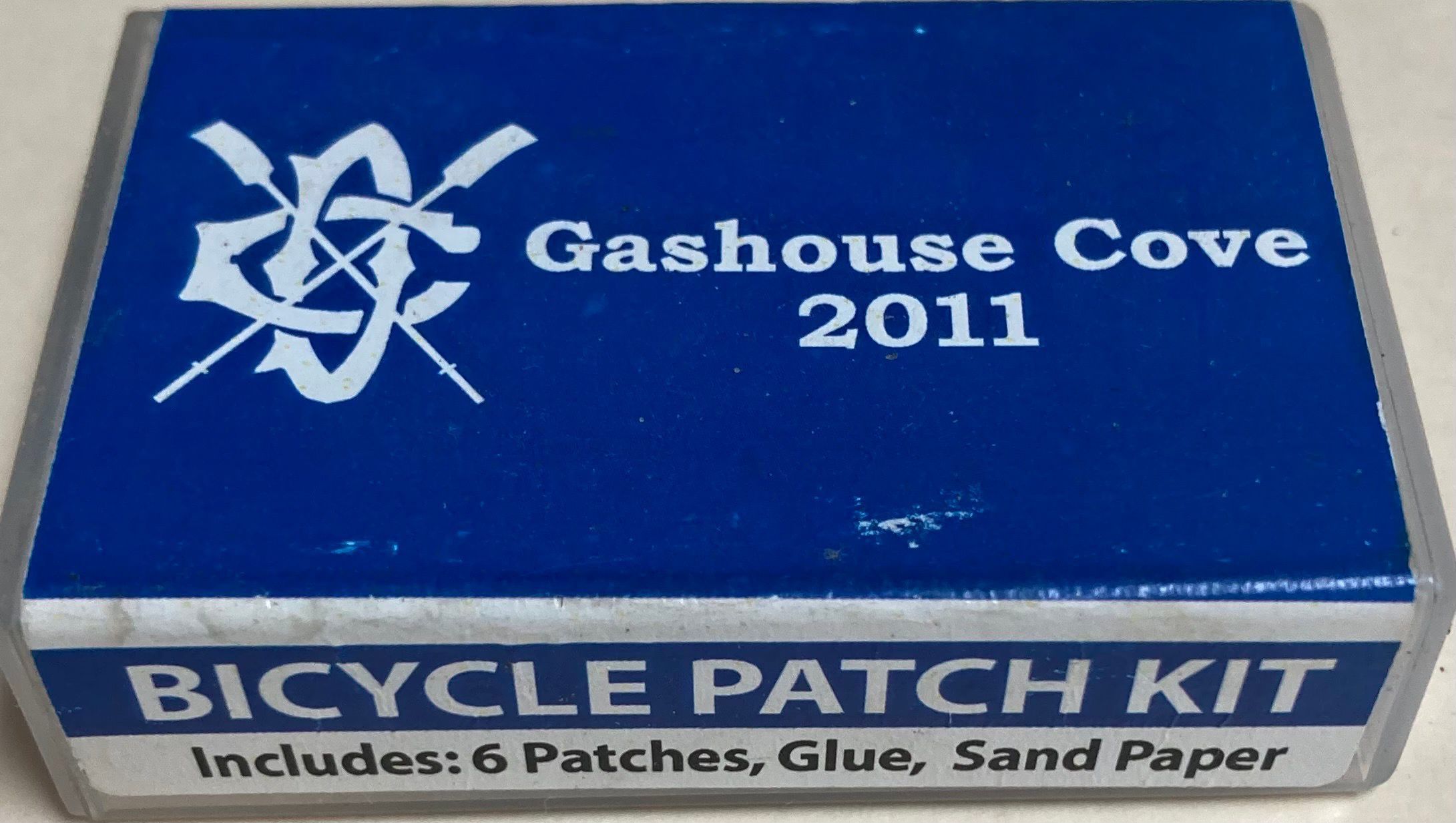 Text on top: "Crossed oars logo - Gashouse Cove - 2011." On side: "Bicycle Patch Kit - Includes: 6 patches, Glue, Sand Paper."Use