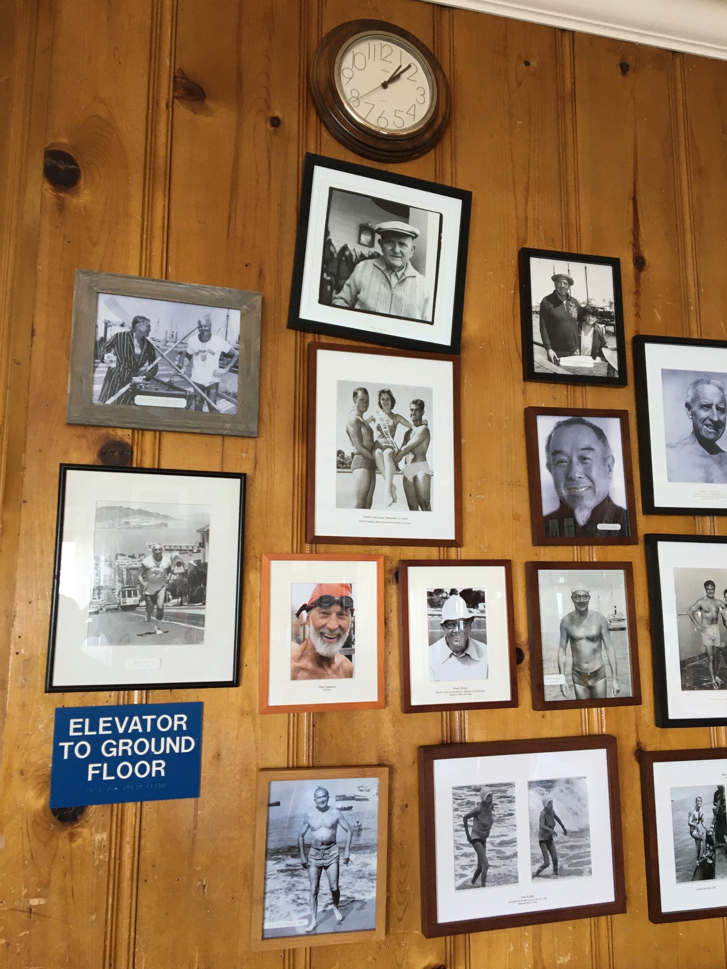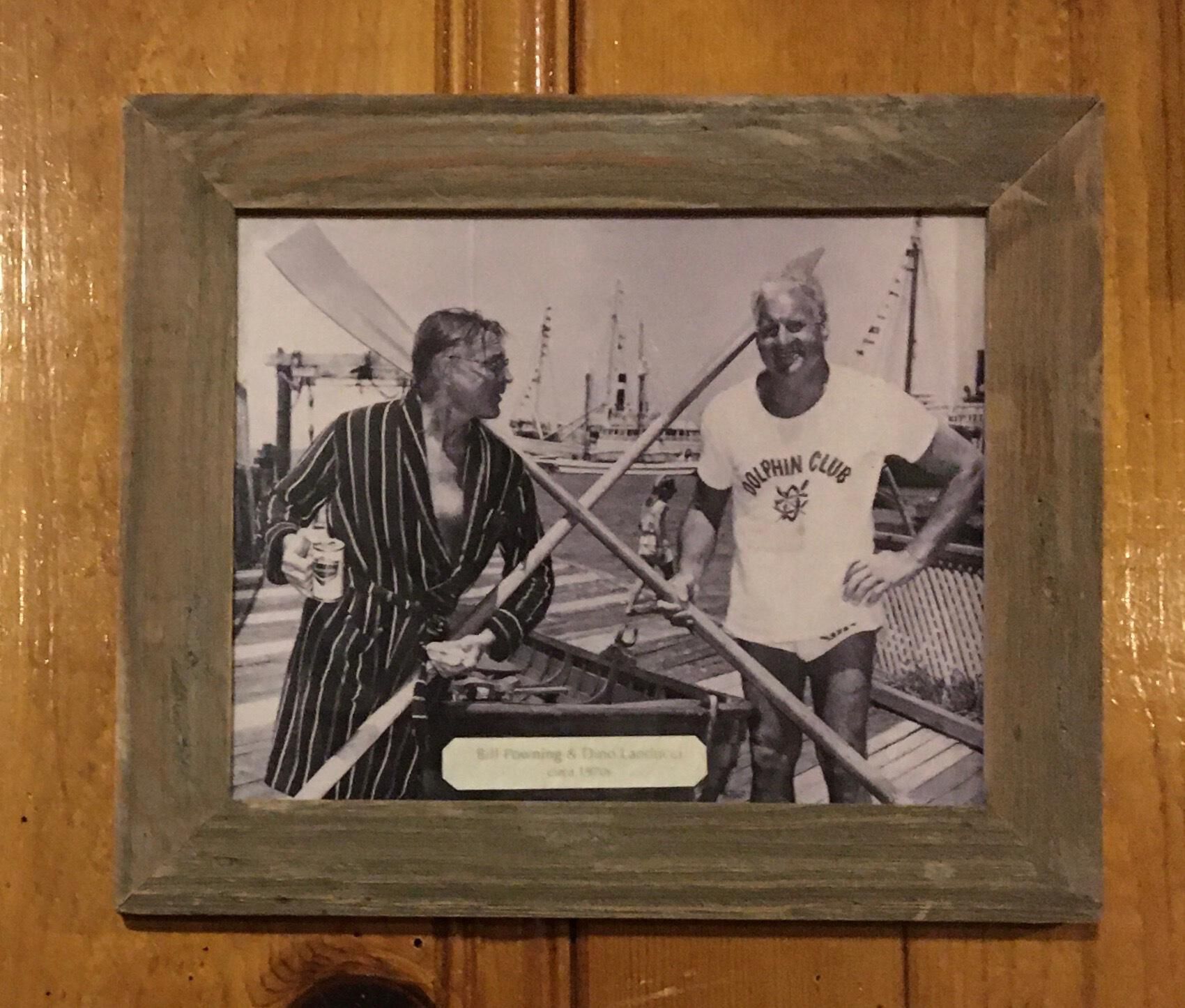 Bill Powning in robe and Dino Landucci Sr. in teeshirt on pier with crossed oars.