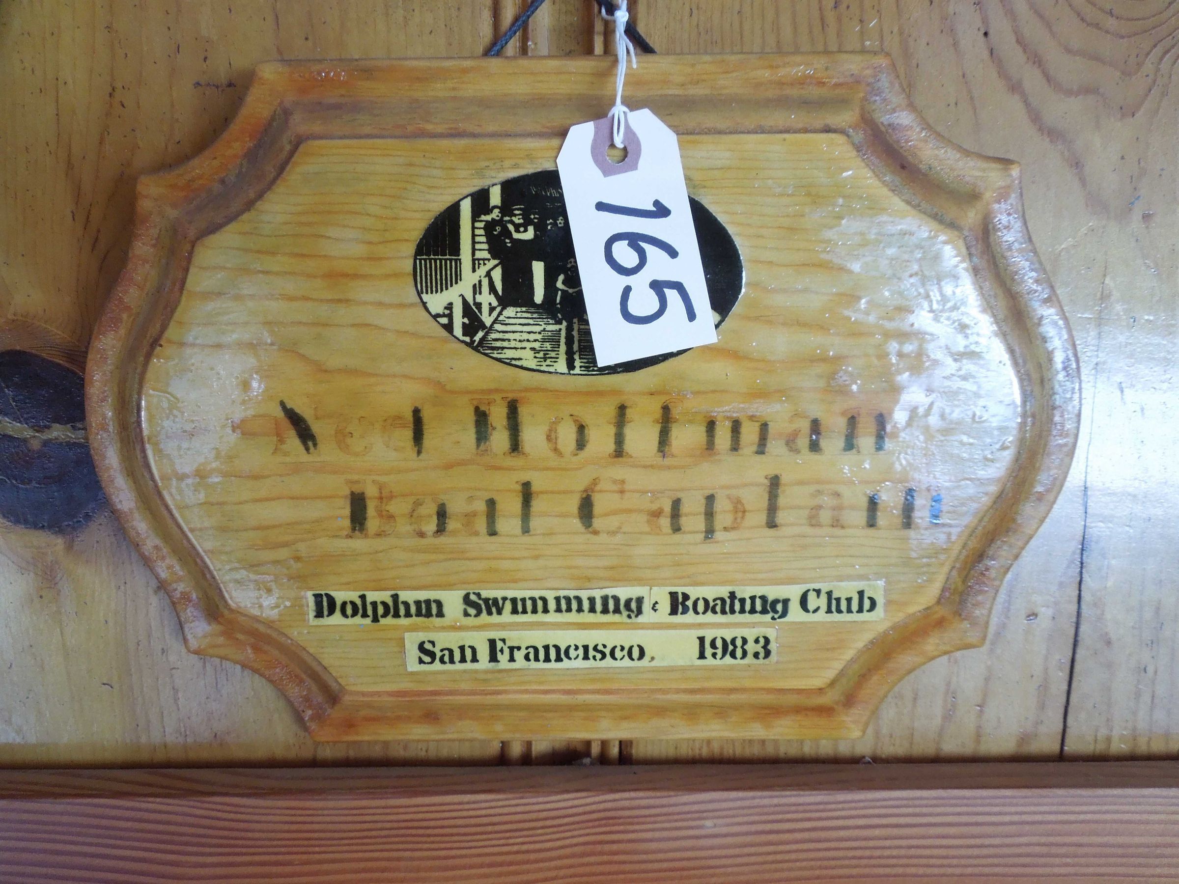 Light colored wooden plaque with black stenciled letters “Ned Hoffman Boat Captain”; horizontal oval picture of early Dolphin Club members (see Photograph 190011);