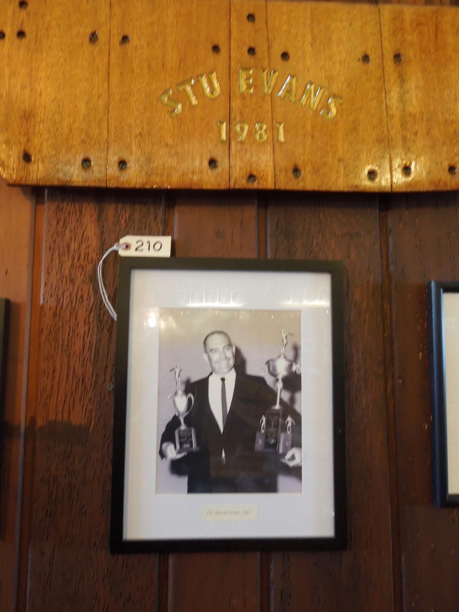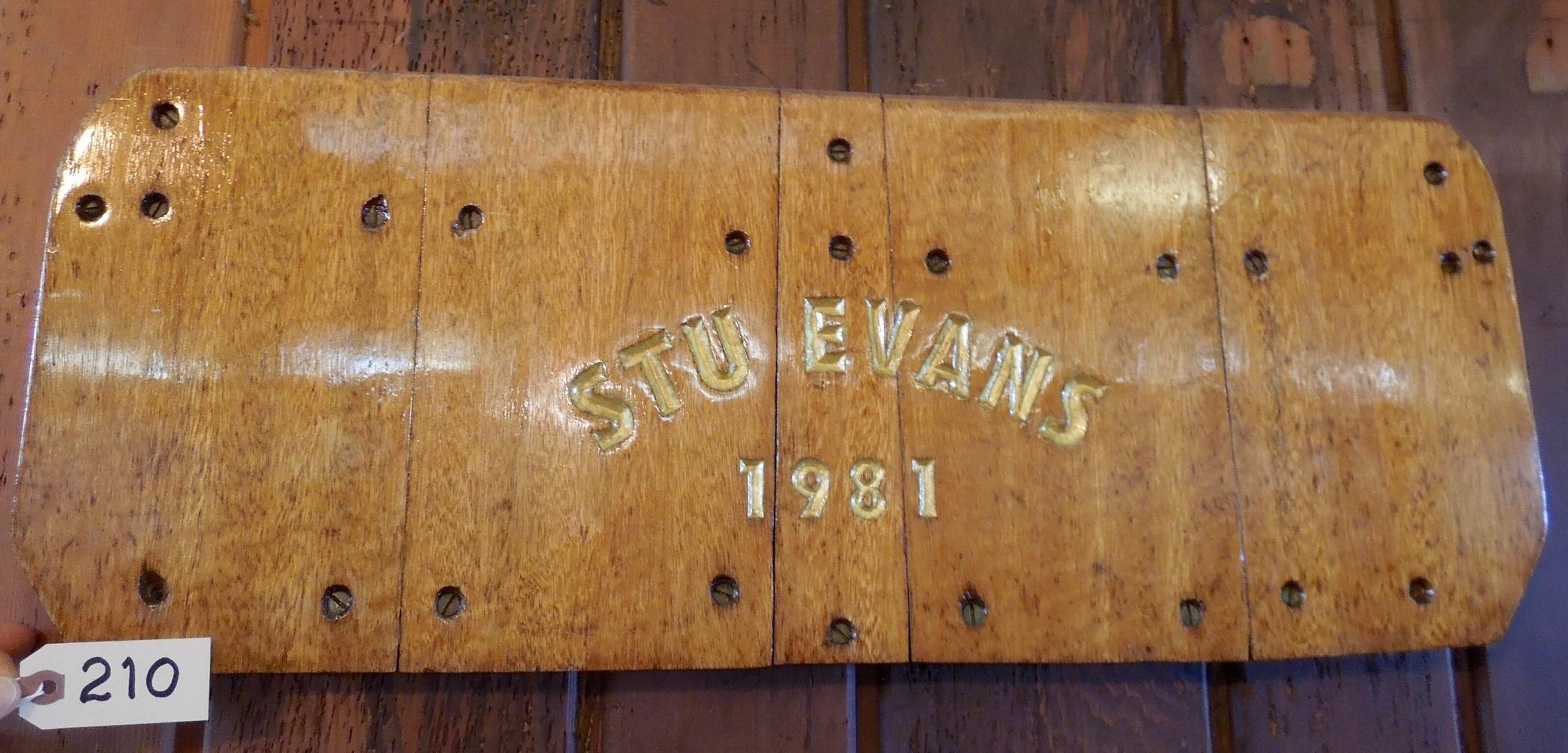 Lacquered wood boat name board engraved with gold letters "Stu Evans 1981"Use
