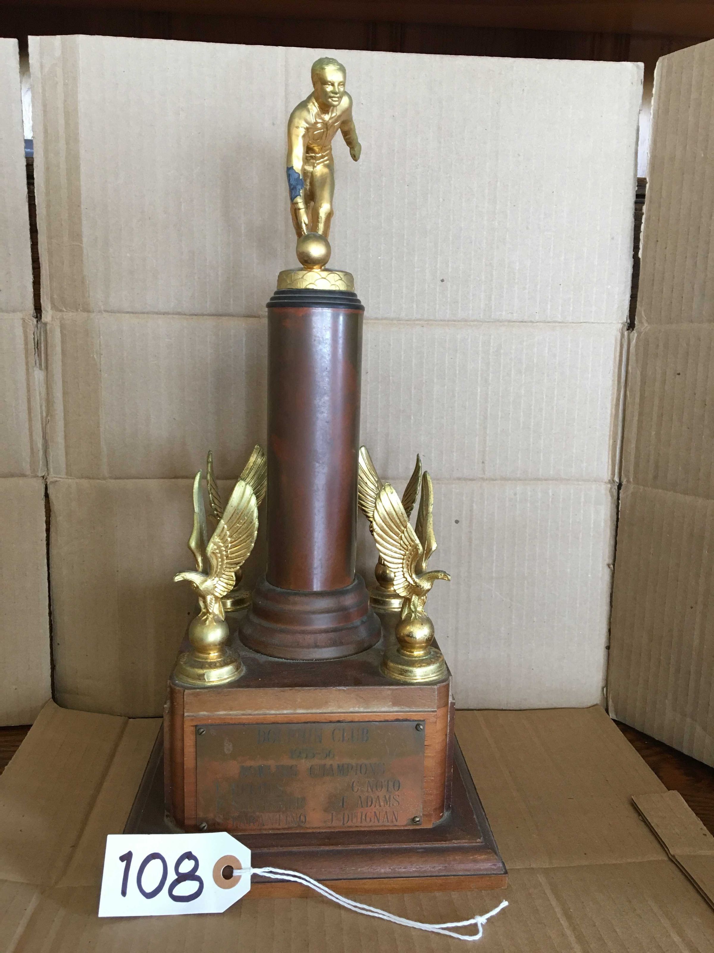 Statue of bowler atop cylindrical pedestal on square wood base with eagles at 4 corners; Brass plate on wood base engraved: Dolphin Club - 1955-56 - Bowling Champions - 6 names