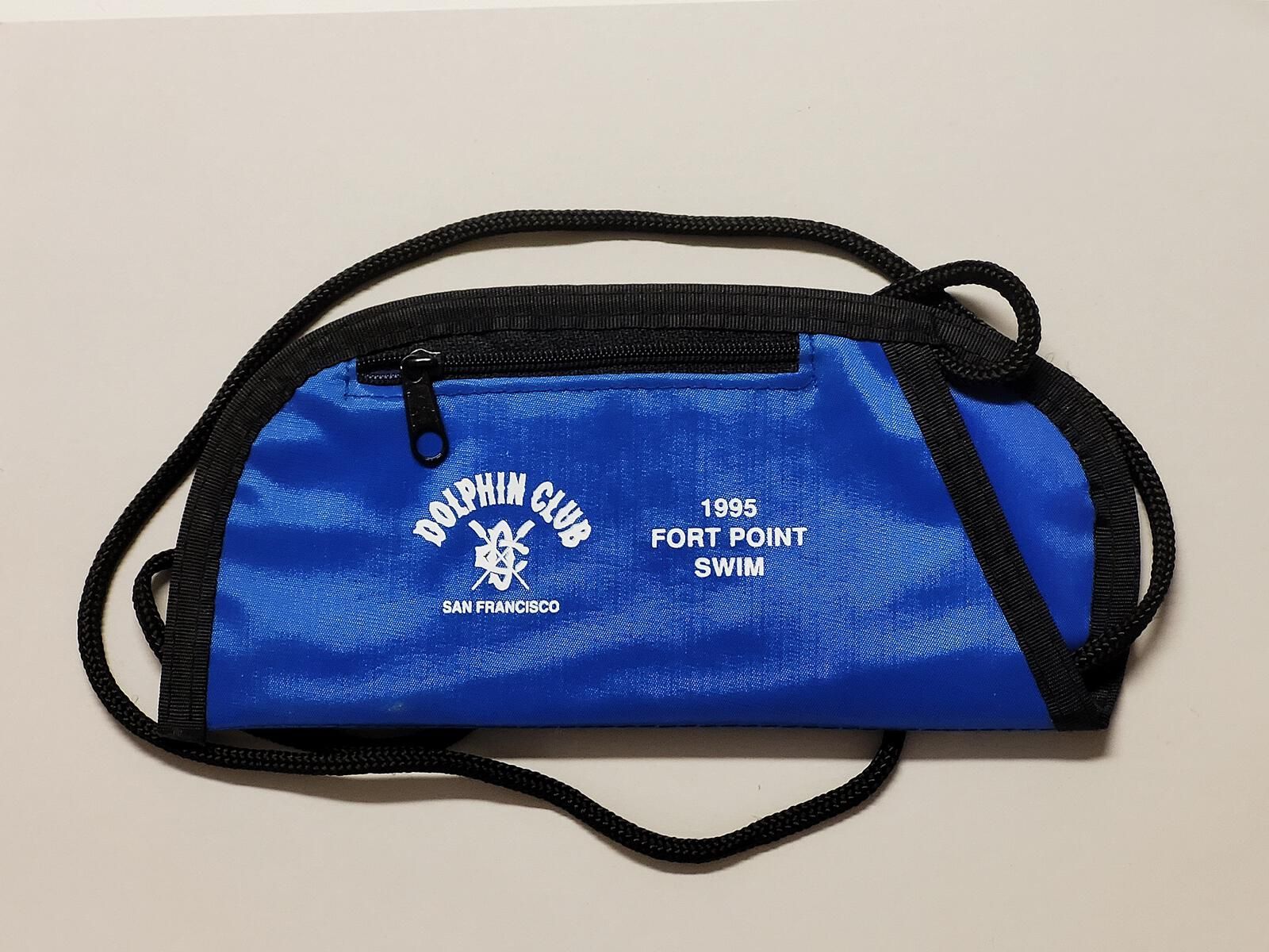 Dolphin blue pouch for eyeglasses or sunglasses. Can be attached to a belt or hung around the neck. Also provides a zippered compartment for keys or coins. White printing: Dolphin Club - logo - San Francisco Fort Point Swim - 1995.