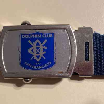 On belt buckle: Blue shield, writing clear so shows silver color of buckle: Dolphin Club crossed oars logo, 1877, San Francisco"Dimensions
