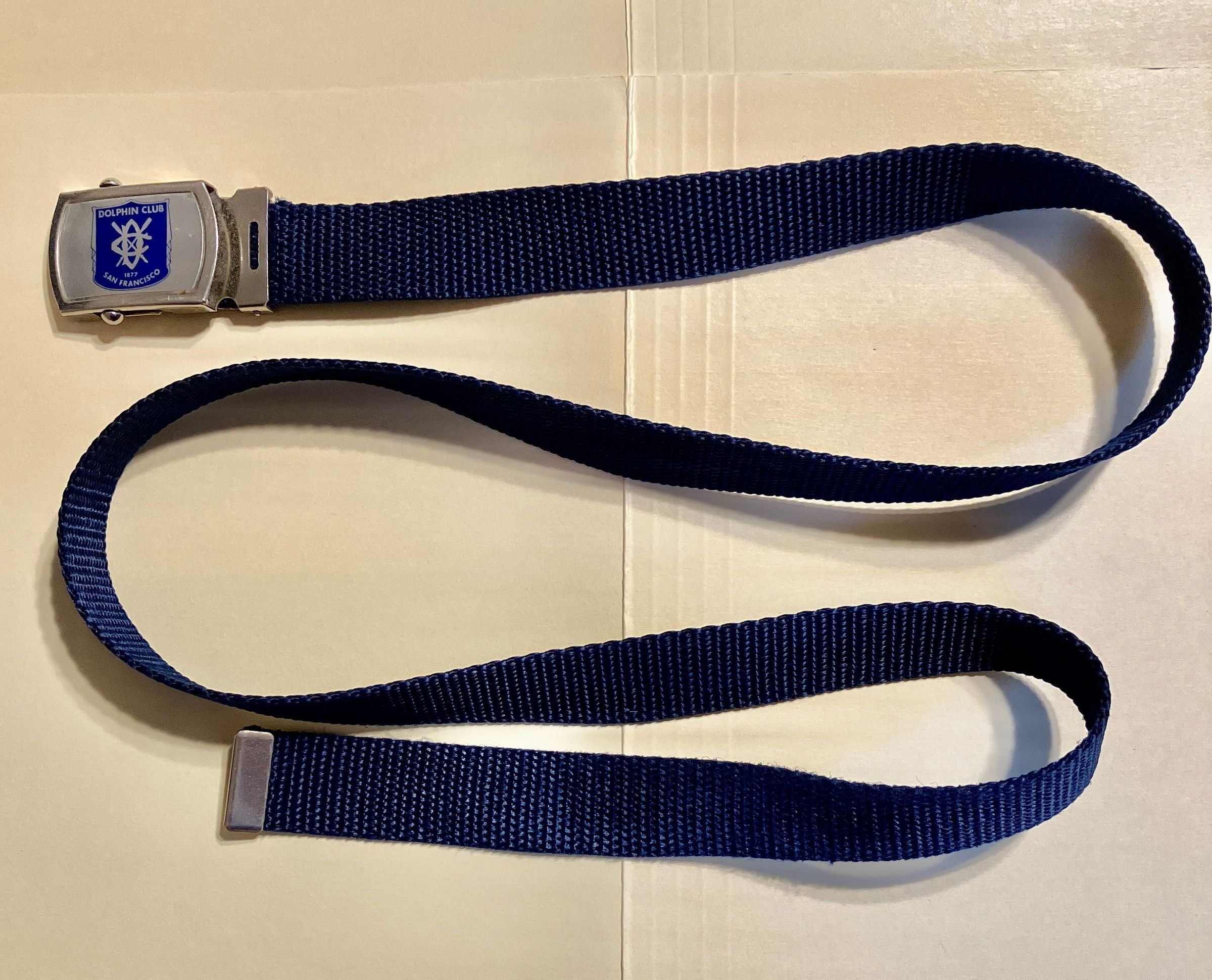 Navy blue web belt with silver color buckle with Dolphin Club shield style logo. Silver color band on end.