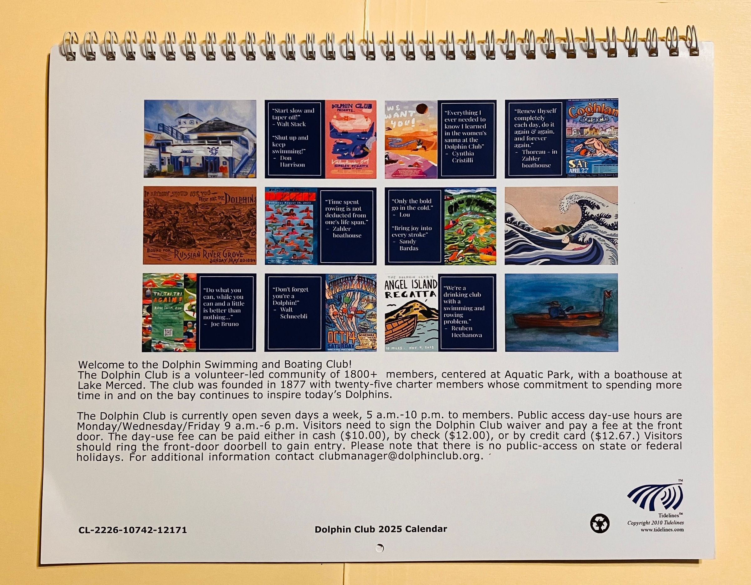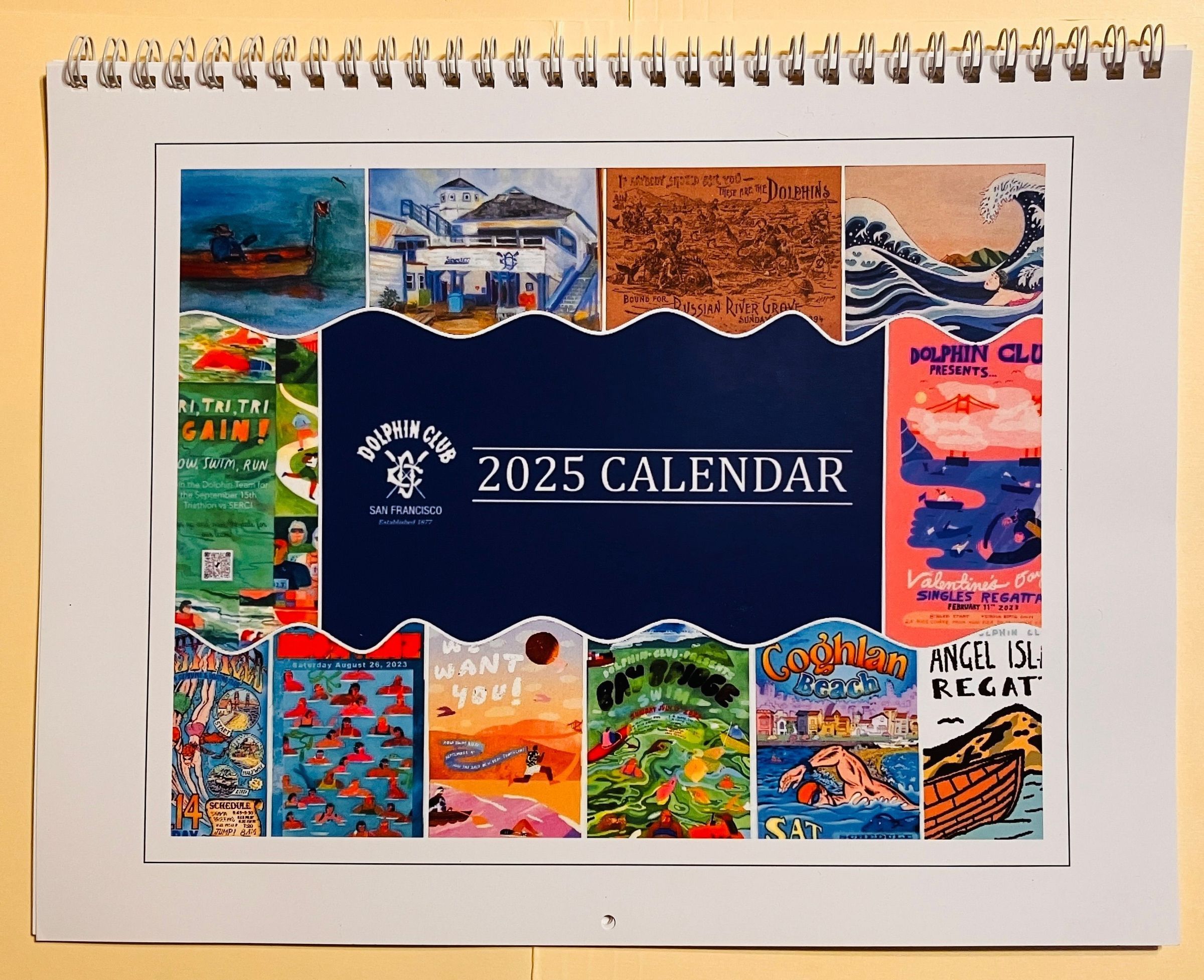 Calendar on sale to members. Most months feature a poster for a swim or regatta, but some months feature artwork from trinkets (August and December, one painting (January) and an 1894 picnic invitation (May).