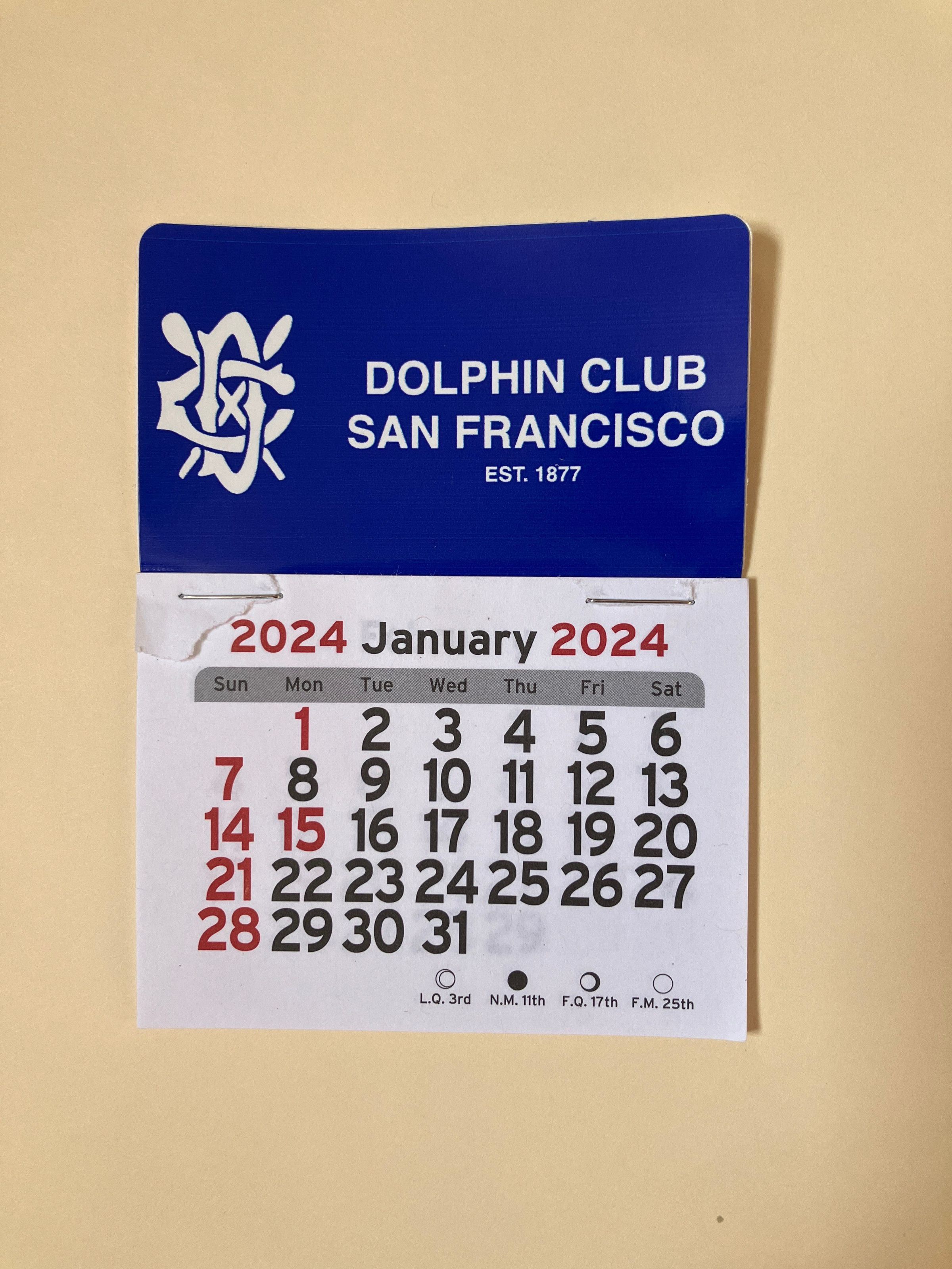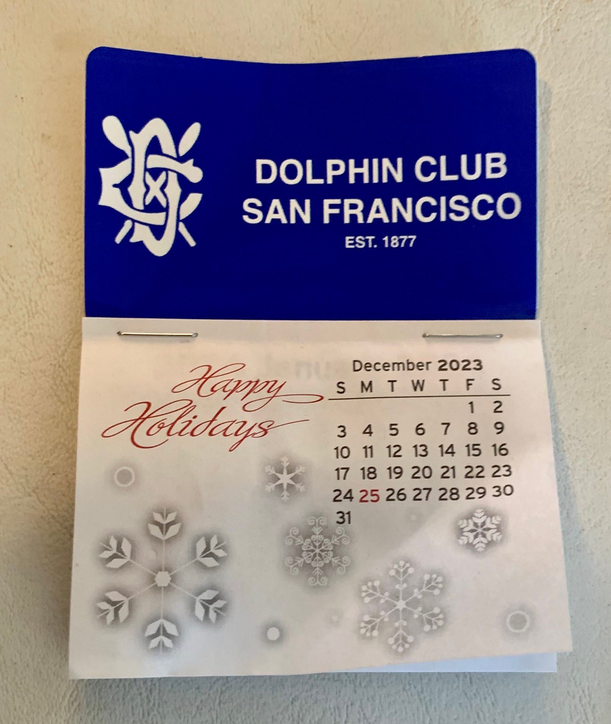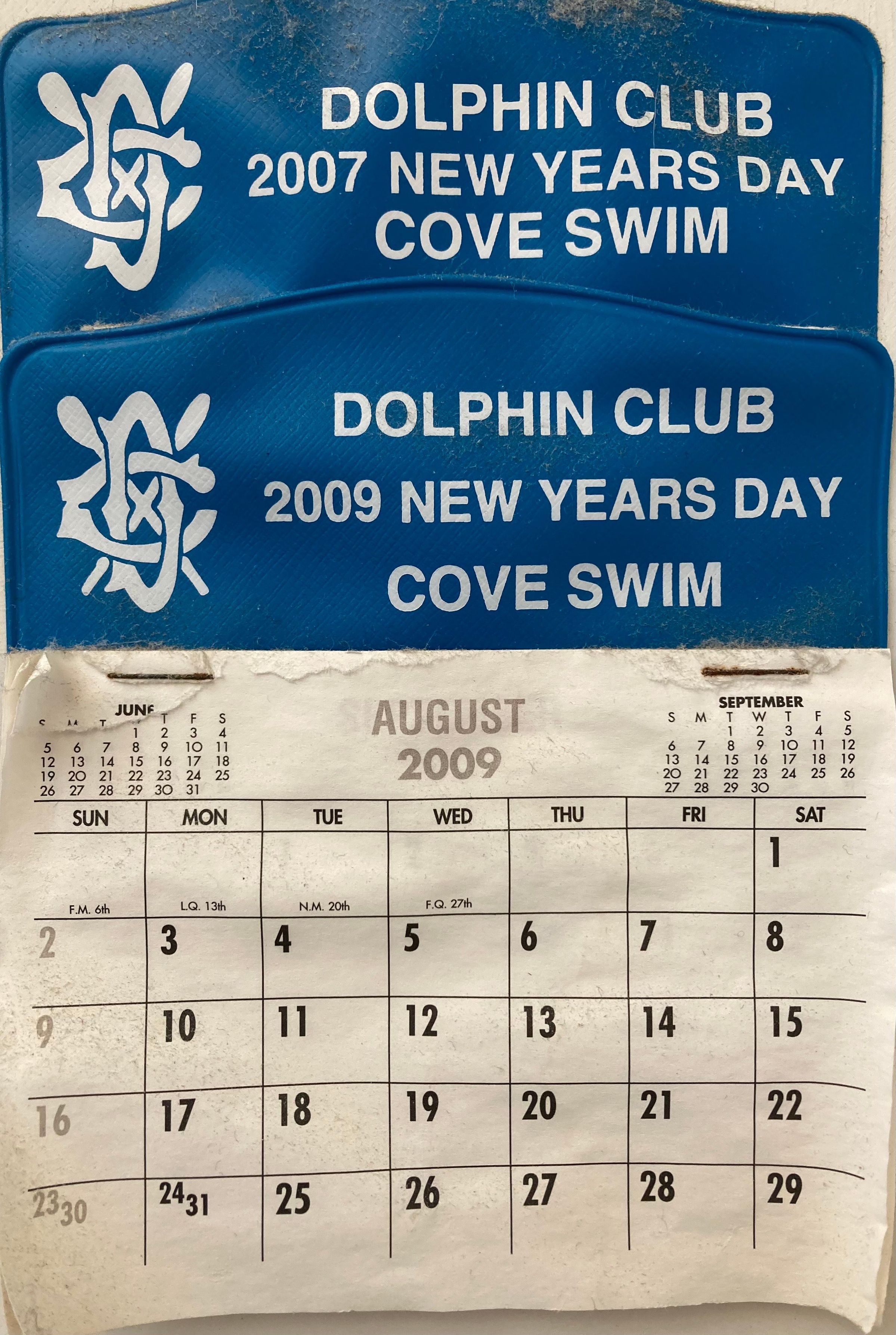 Small calendar with paper month pages stapled to blue plastic backing, given as trinket every year for New Year's Day cove swim. Text in white.
