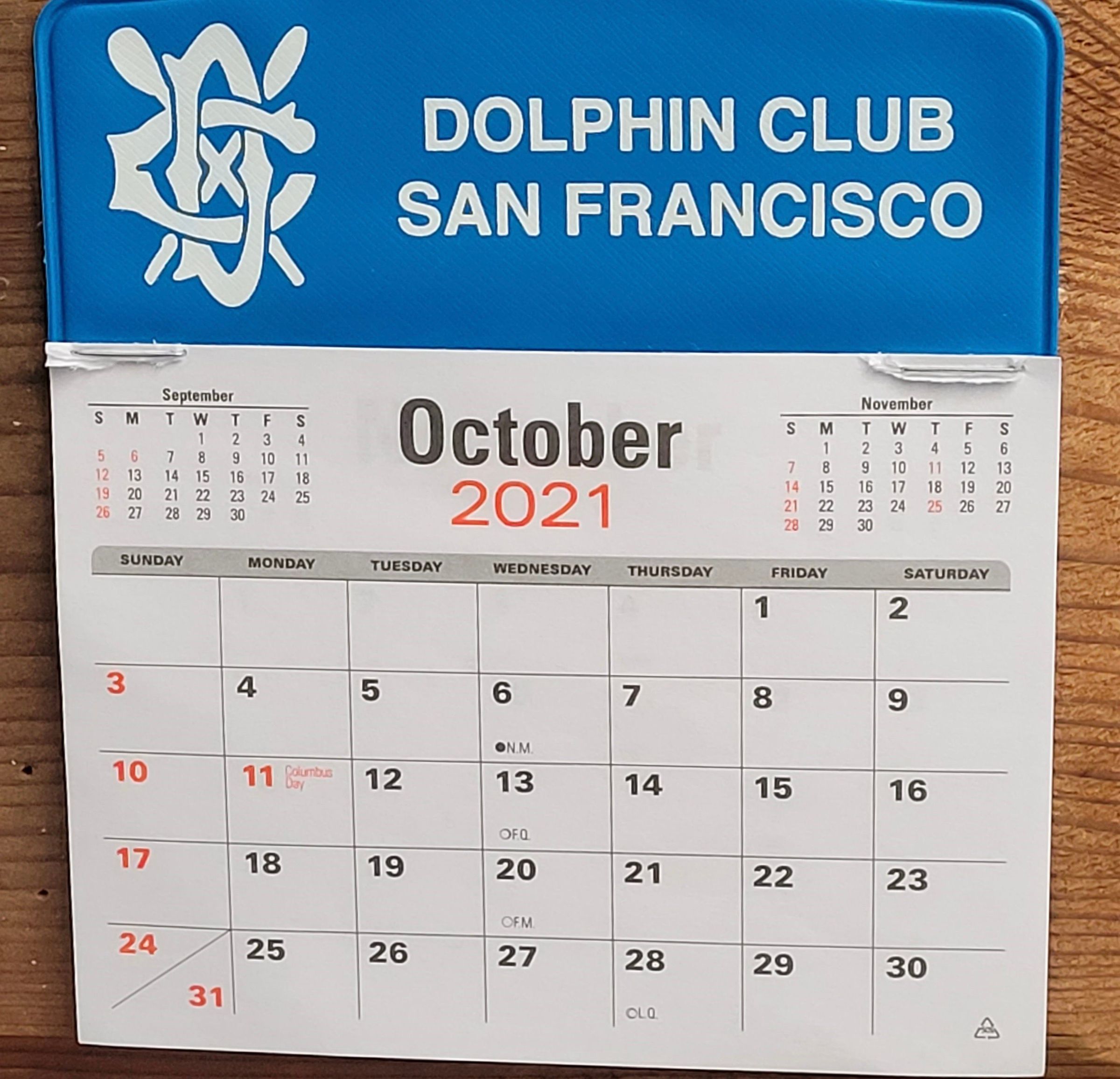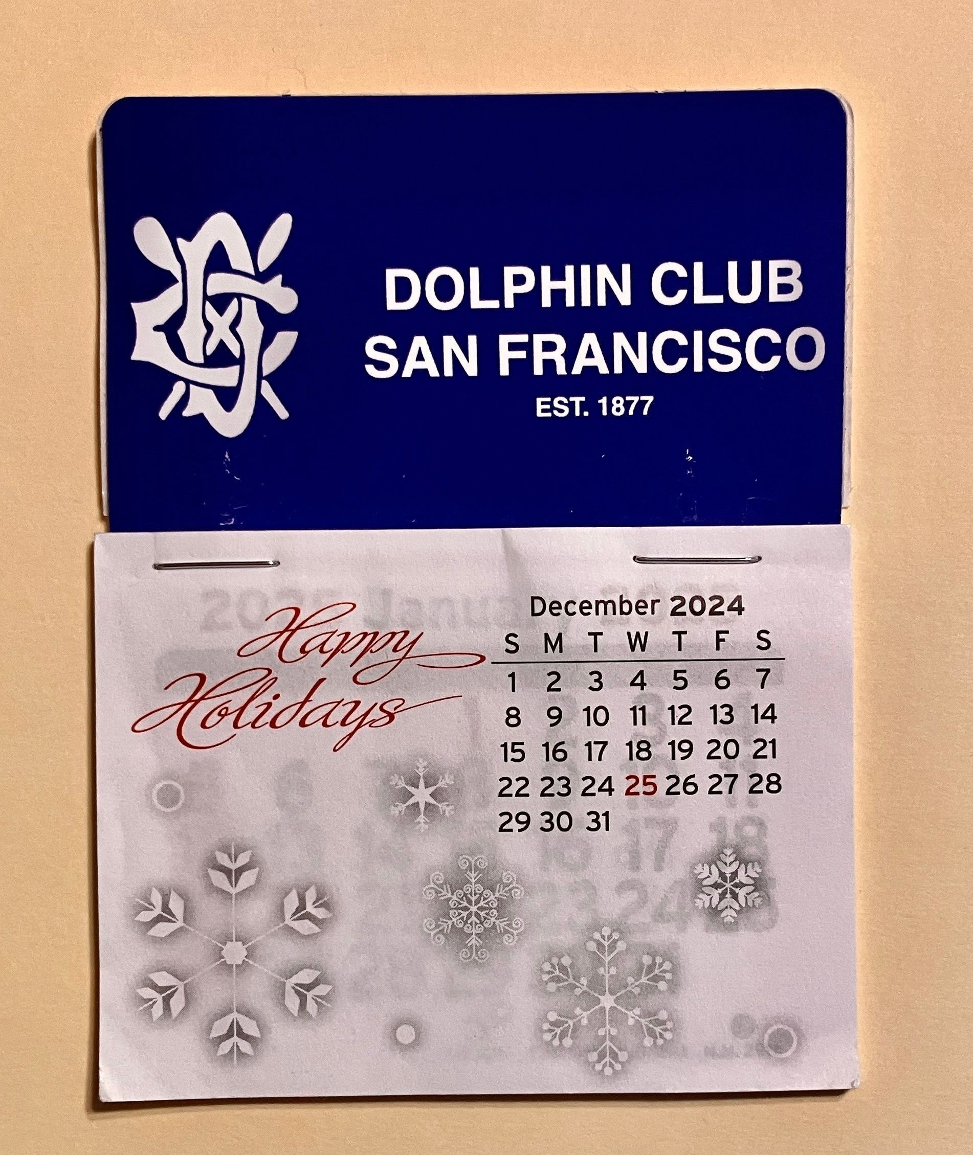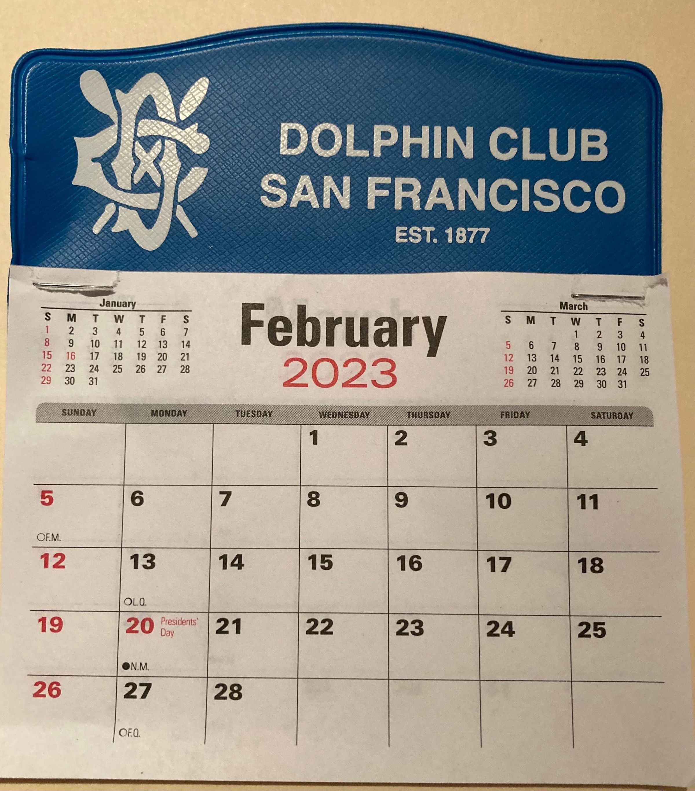 Small calendar with paper month pages stapled to blue plastic backing, given as trinket every year for New Year's Day cove swim. Text in white.
