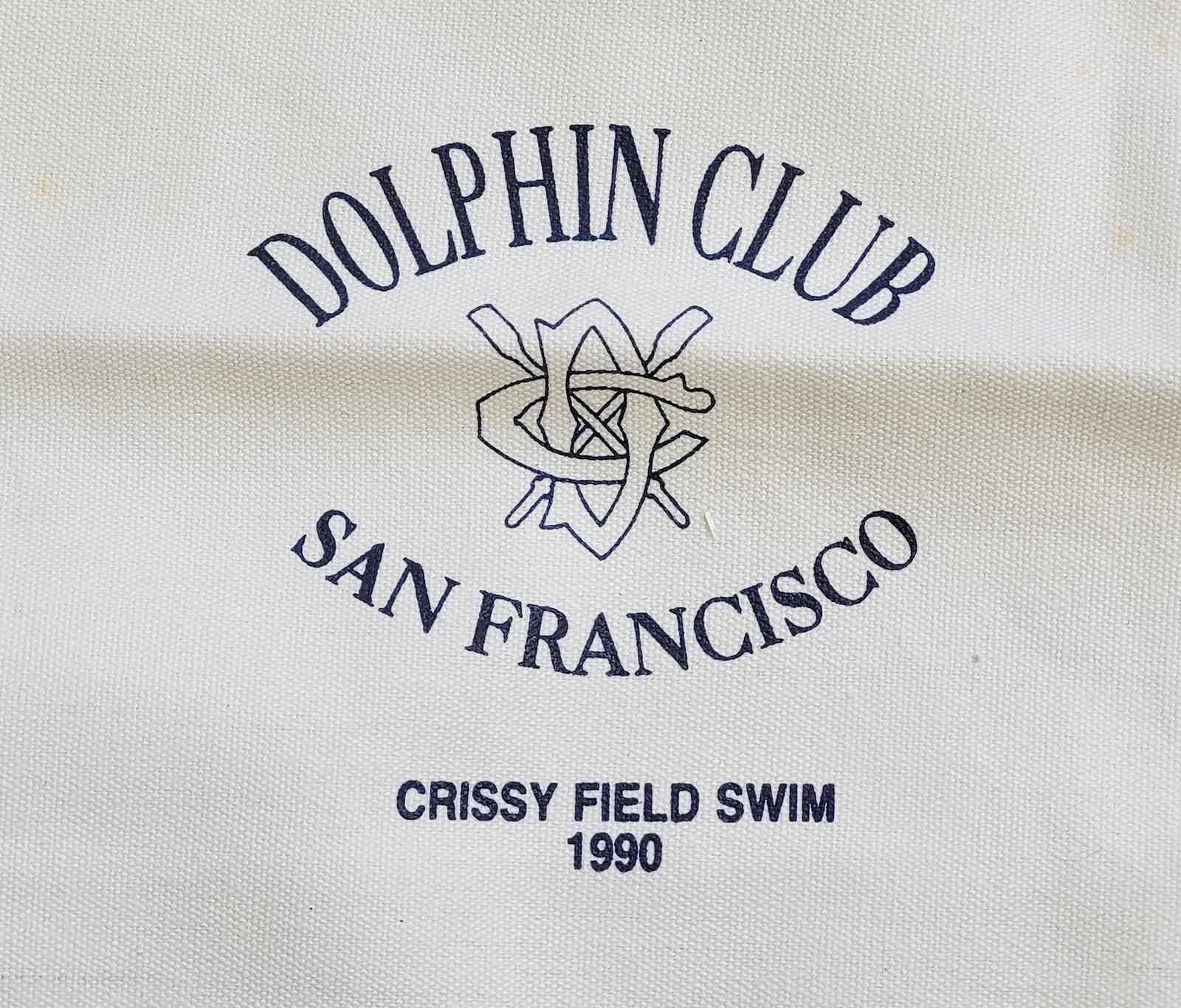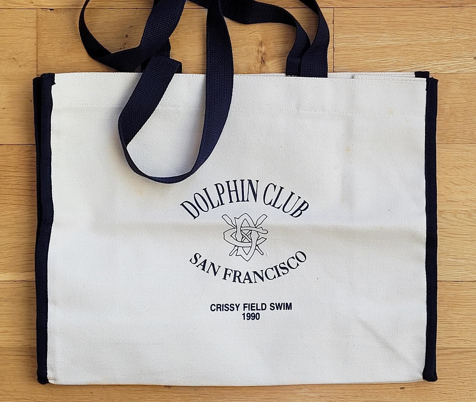 Light canvas bag in rectangular shape, with navy piping around both side panels, and any blue handles. On front in navy blue letters: Dolphin Club - outlined logo - San Francisco - Crissy Field Swim - 1990."Use