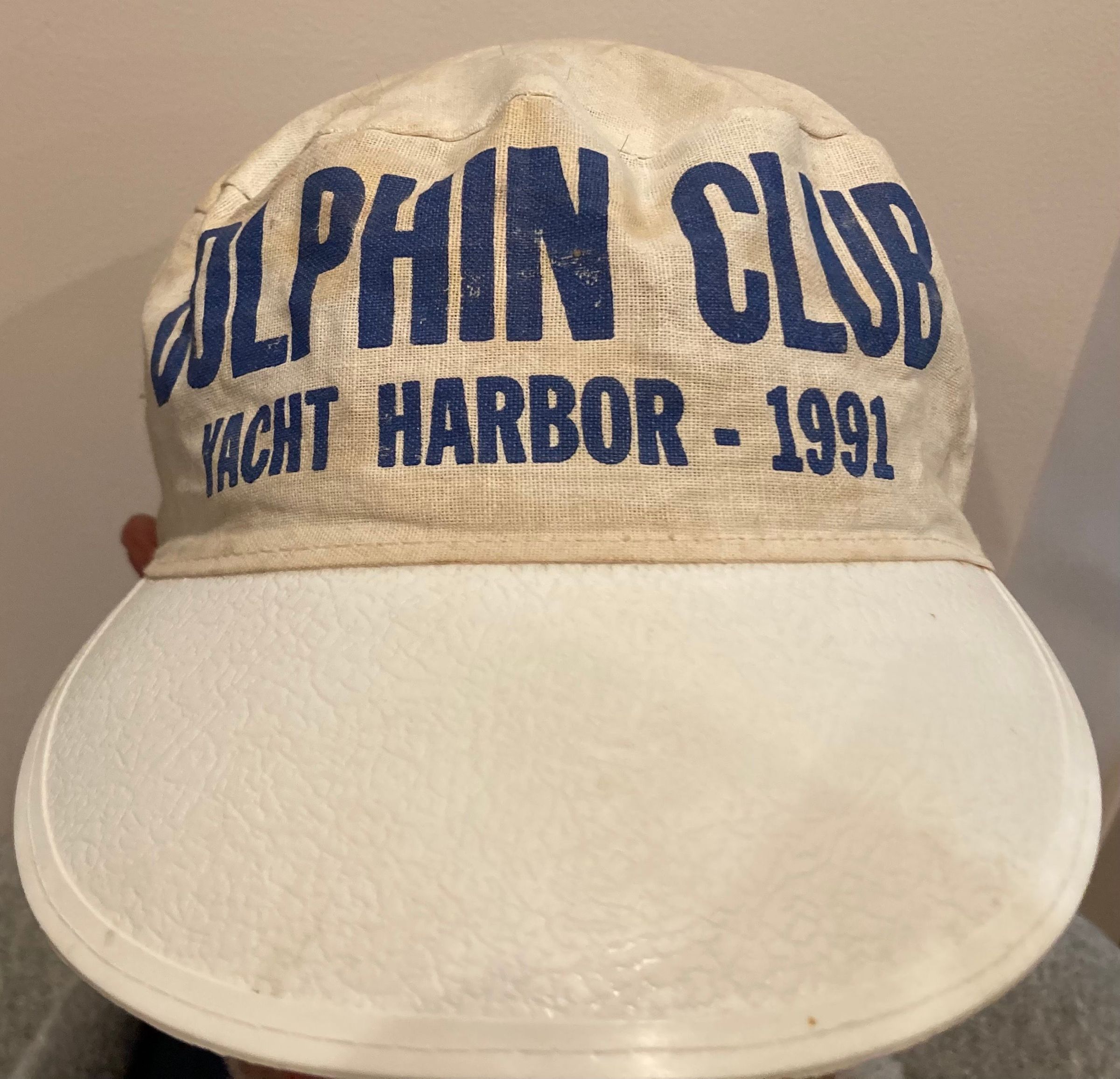 White cloth painter's cap style had with large plastic visor and blue print. Text: "Dolphin Club - Yacht Harbor - 1991."