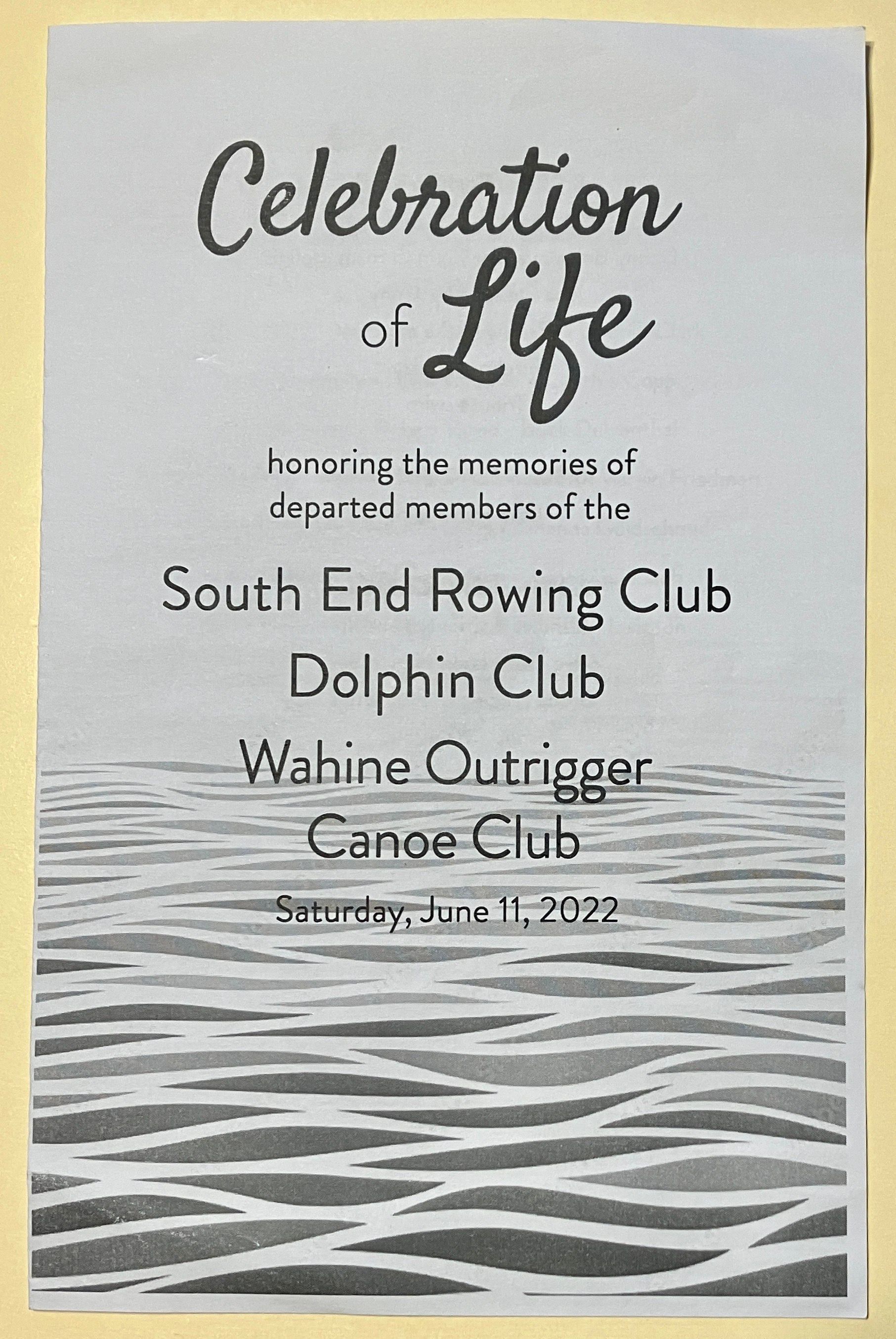 Program for joint Celebration of Life by South End Rowing Club, Dolphin Club, and Wahini Outrigger Club, in honor of members of the three clubs who died 2020-2022, during the period of Covid-19 restrictions when memorial events were not held.