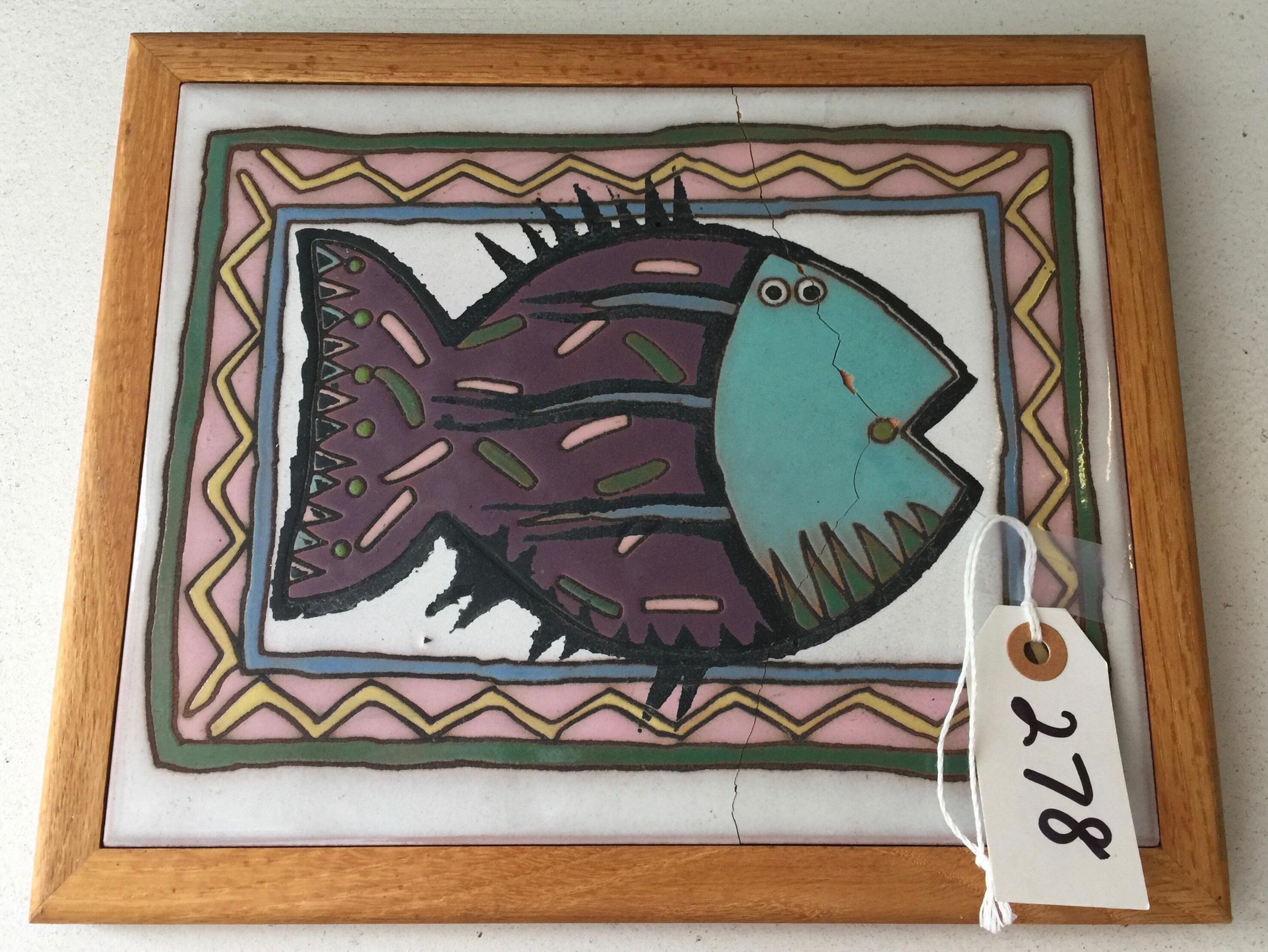 Ceramic panel showing side view of purple, turquoise, pink, and green fish mounted in brown wooden frame.Made/Created