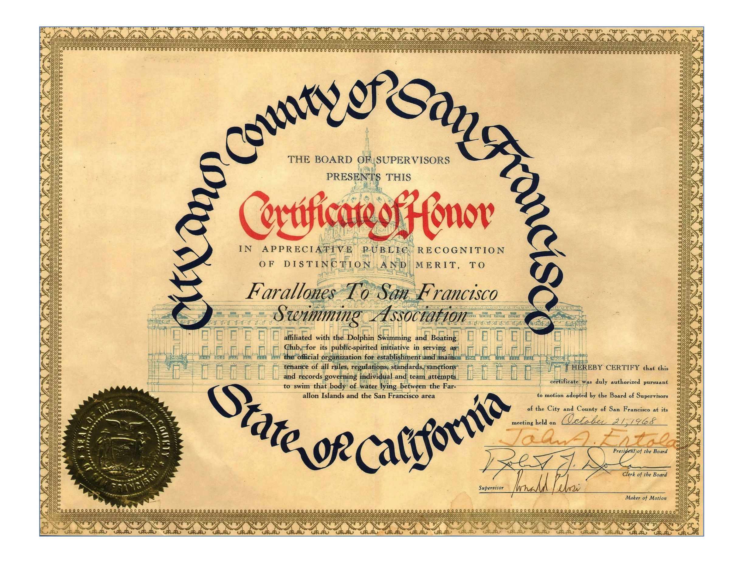 Certificate from City and County of San Francisco in recognition of the "Farallones To San Francisco Swimming Association."