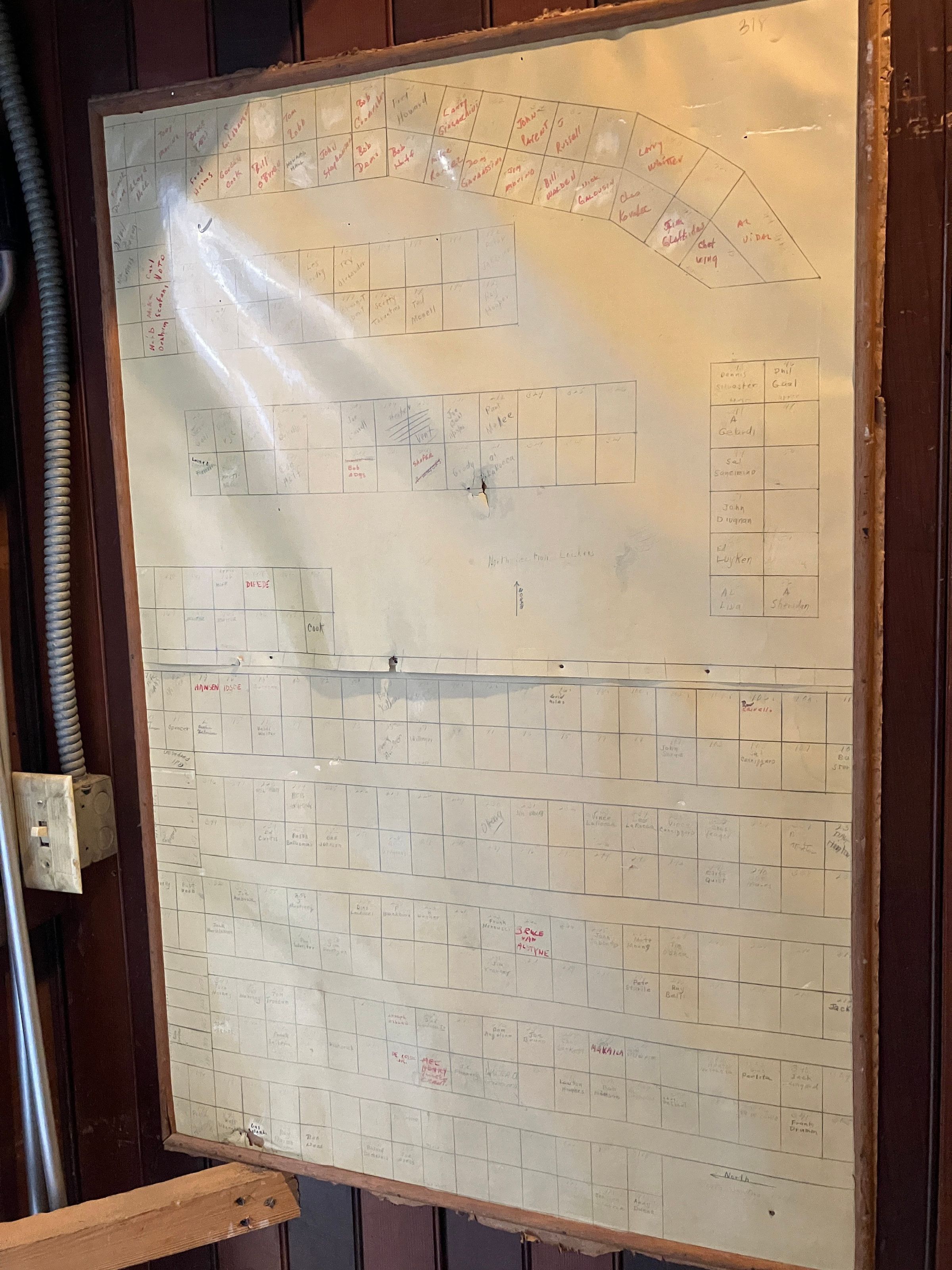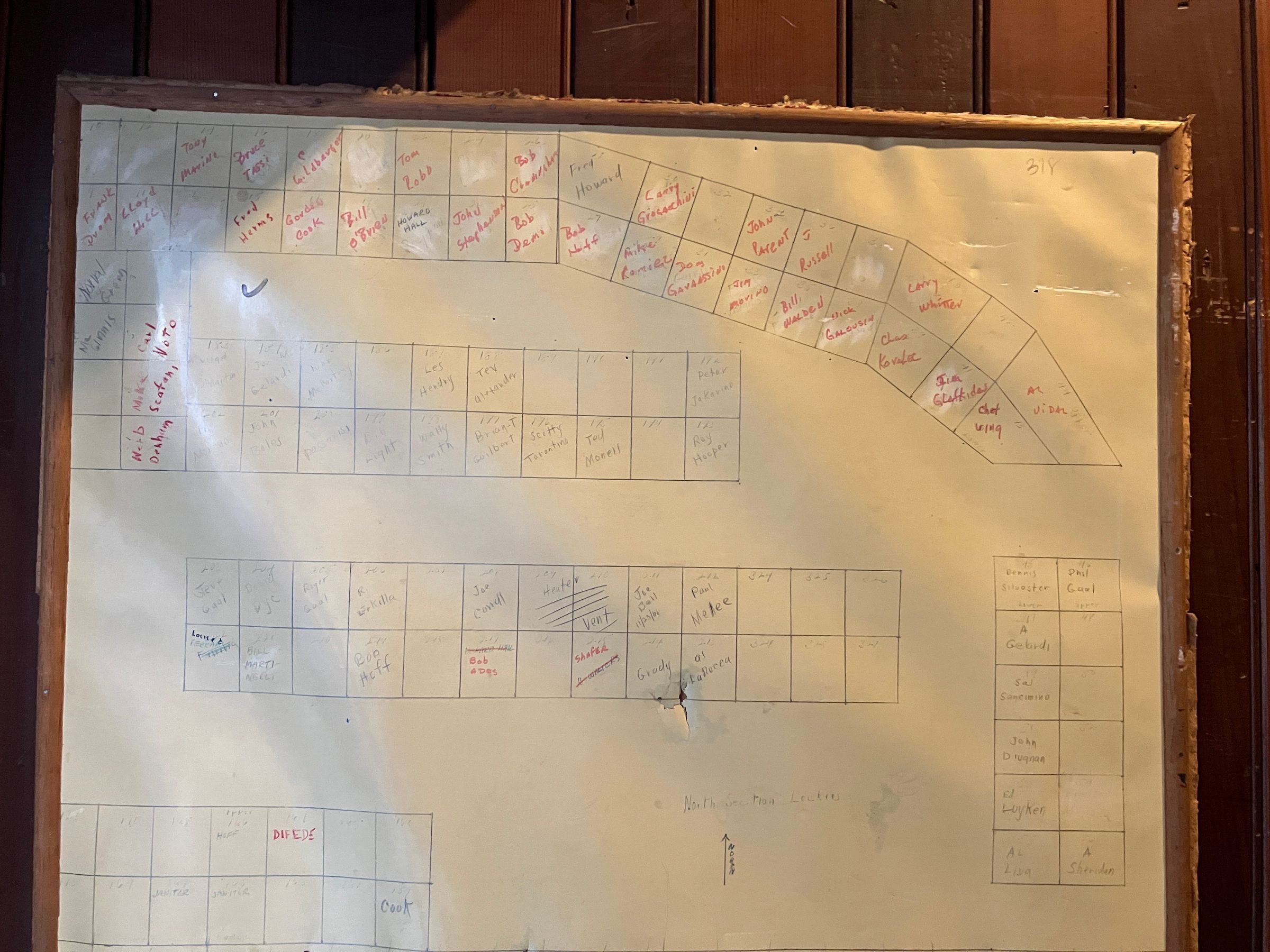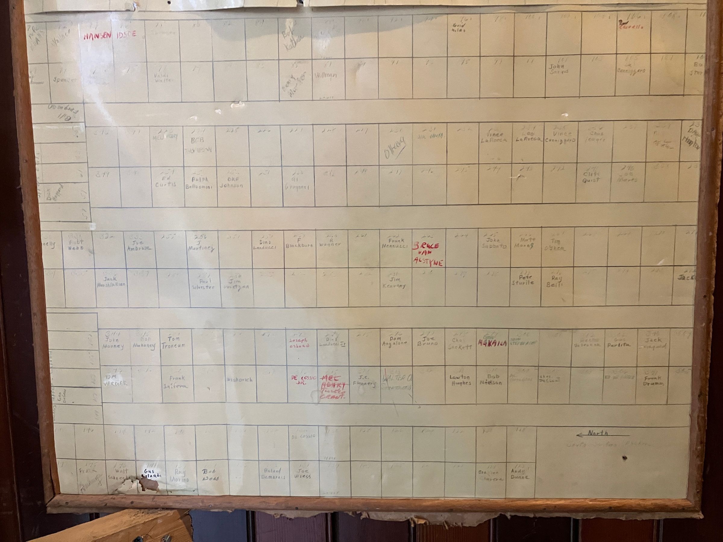 Framed chart of locker assignments in Men's locker room. Attached to east wall of small closet across from Staib Room entry to men's locker room.