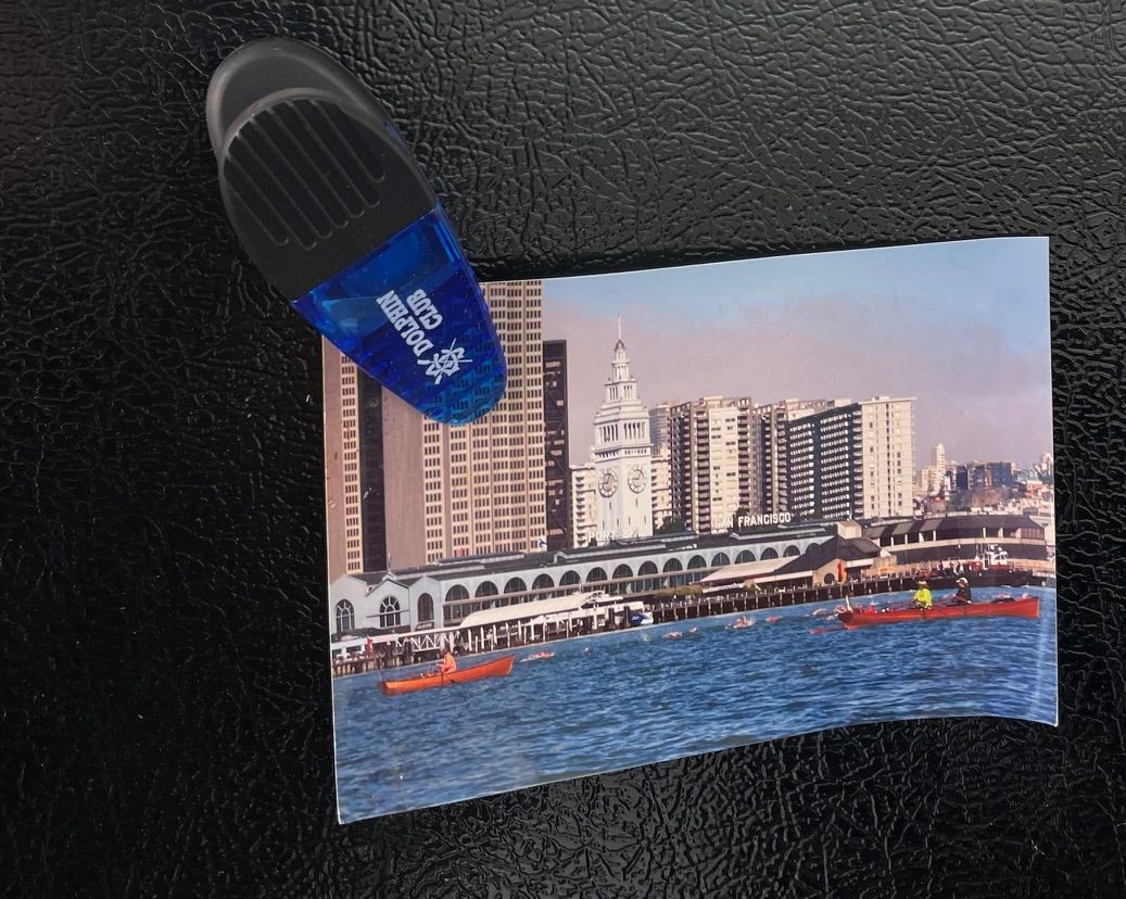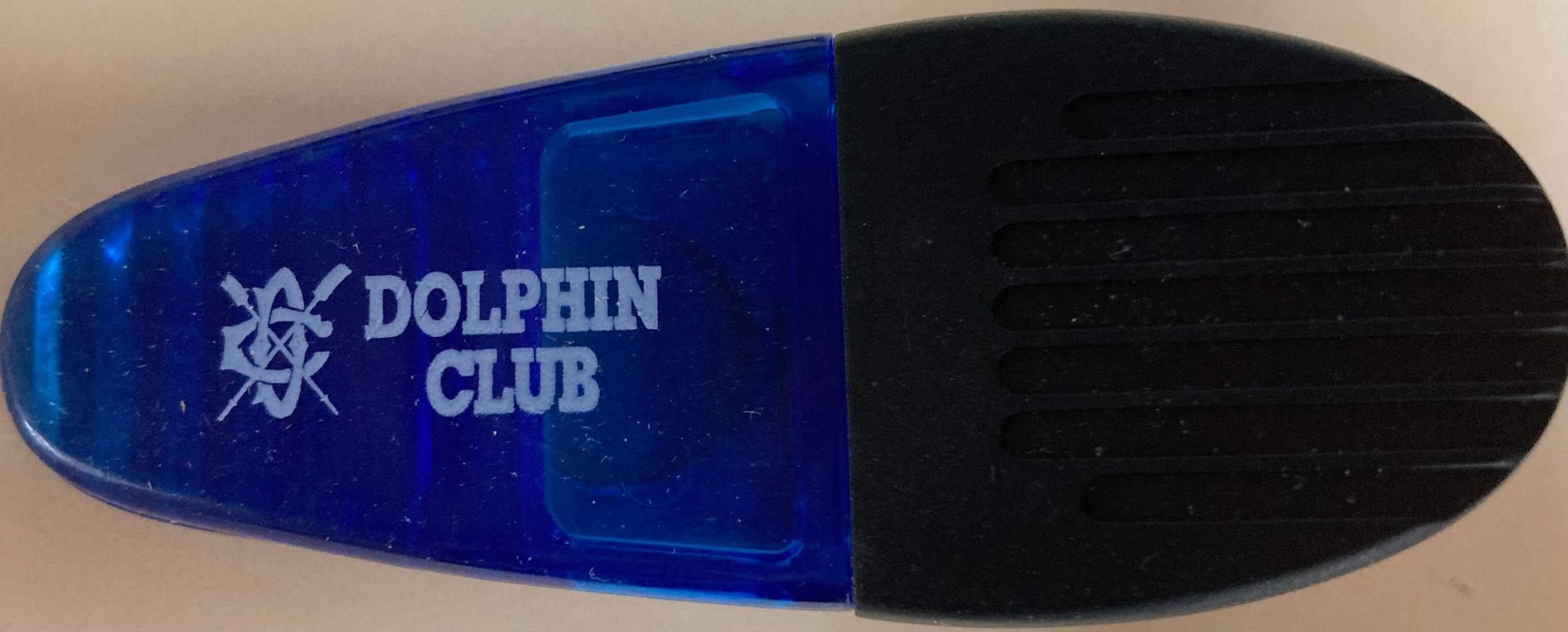 Blue plastic clip with black magnet on wide end and white print. For use on bags or for holding paper/photo on a metal surface.