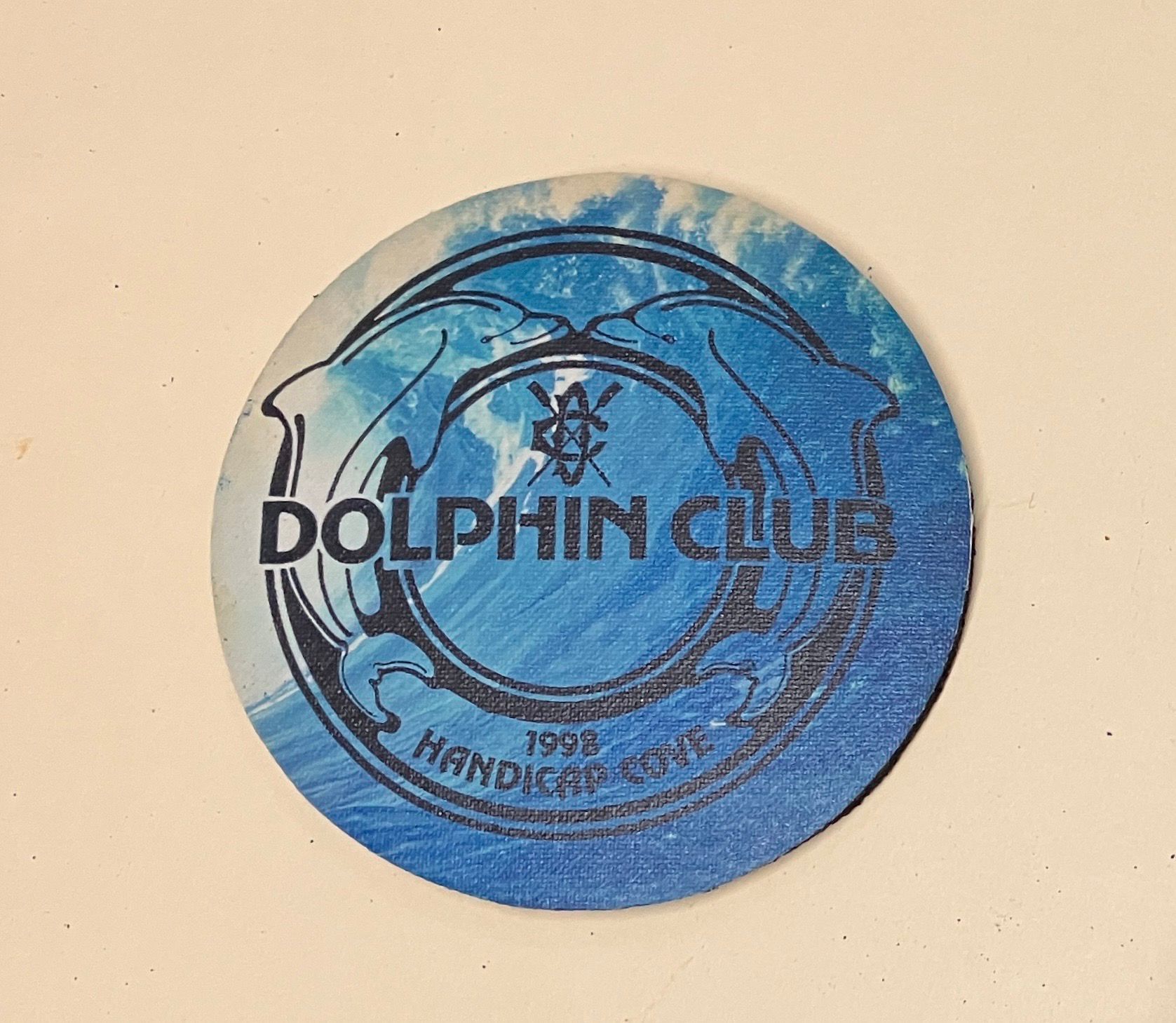 Printed in black on the vinyl top: The DC logo with two dolphins inside a round border, small crossed oars logo inside, Dolphin Club across middle, and the space on the bottom of the logo contains text: "1998 Handicap Cove."Use
