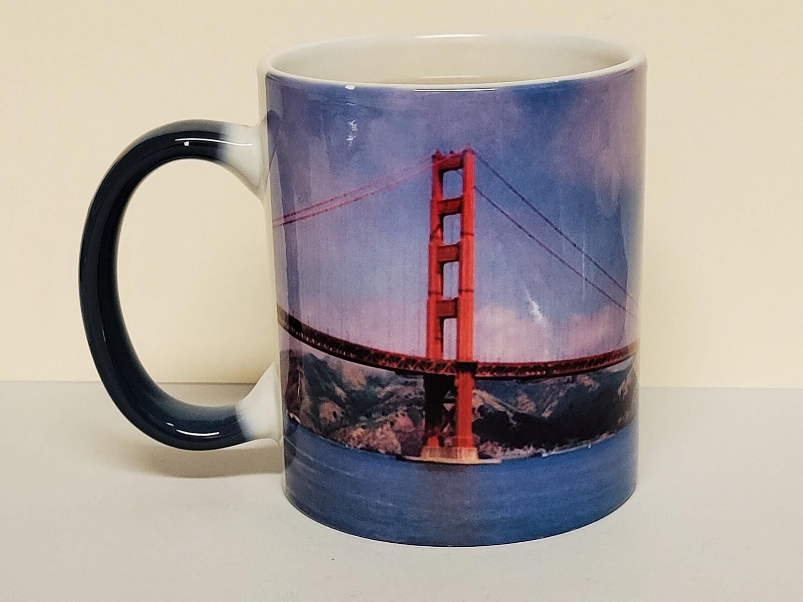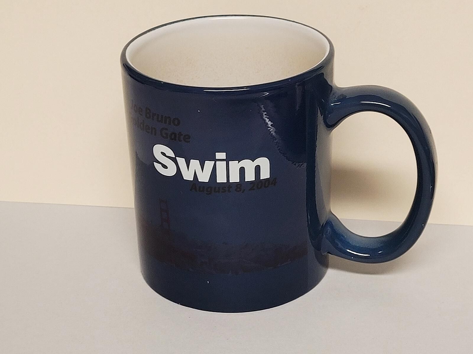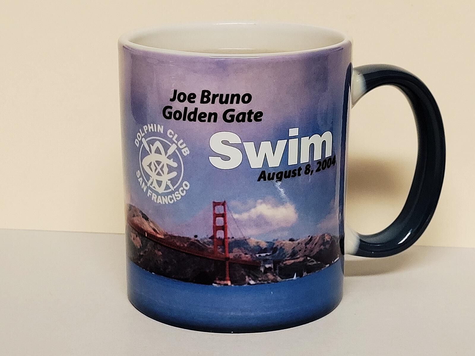 Special coffee mug from the Joe Bruno Golden Gate Swim in 2004. Mug has plain appearance when cold but has a colorful design when filled with hot coffee or tea.