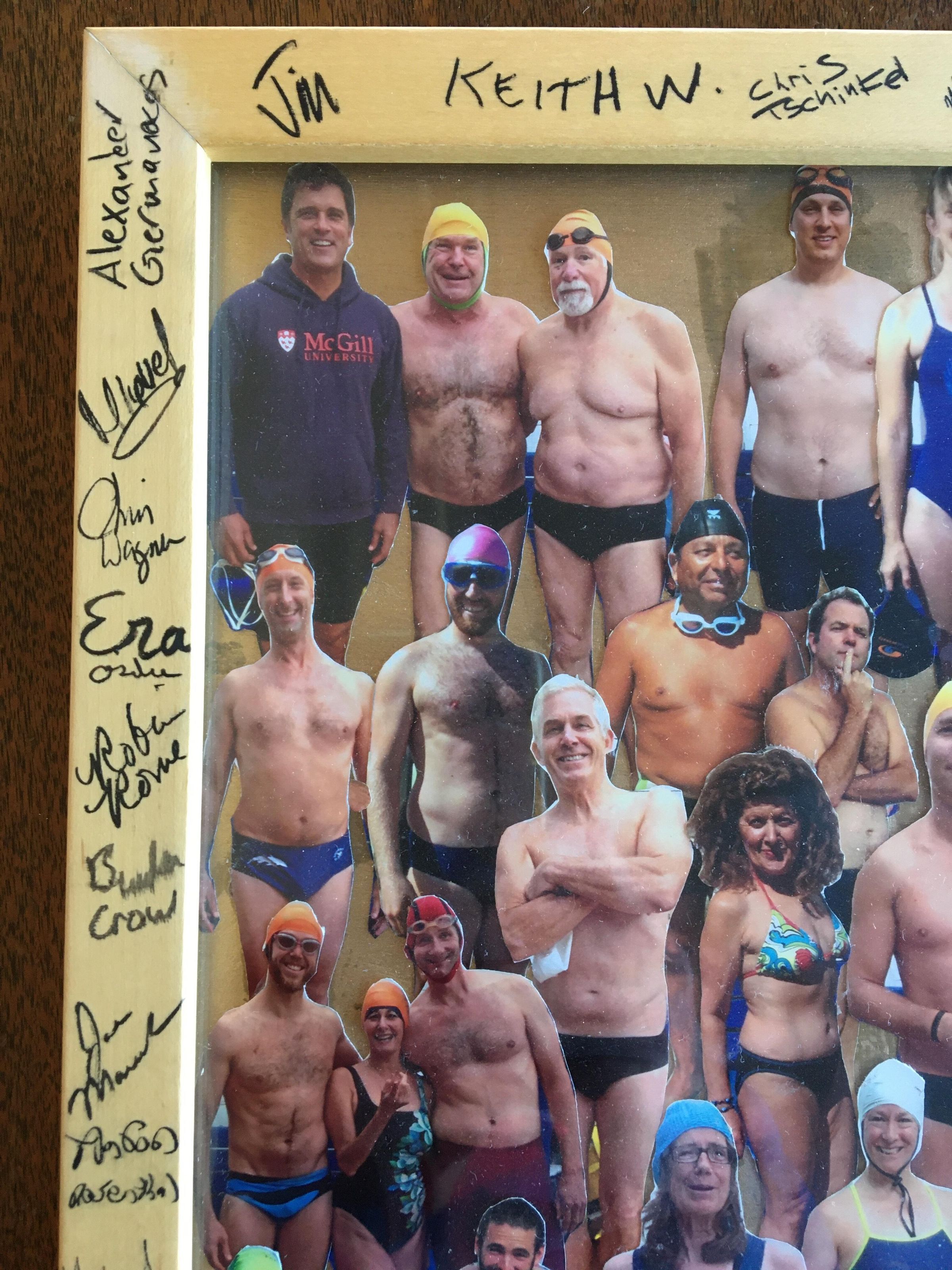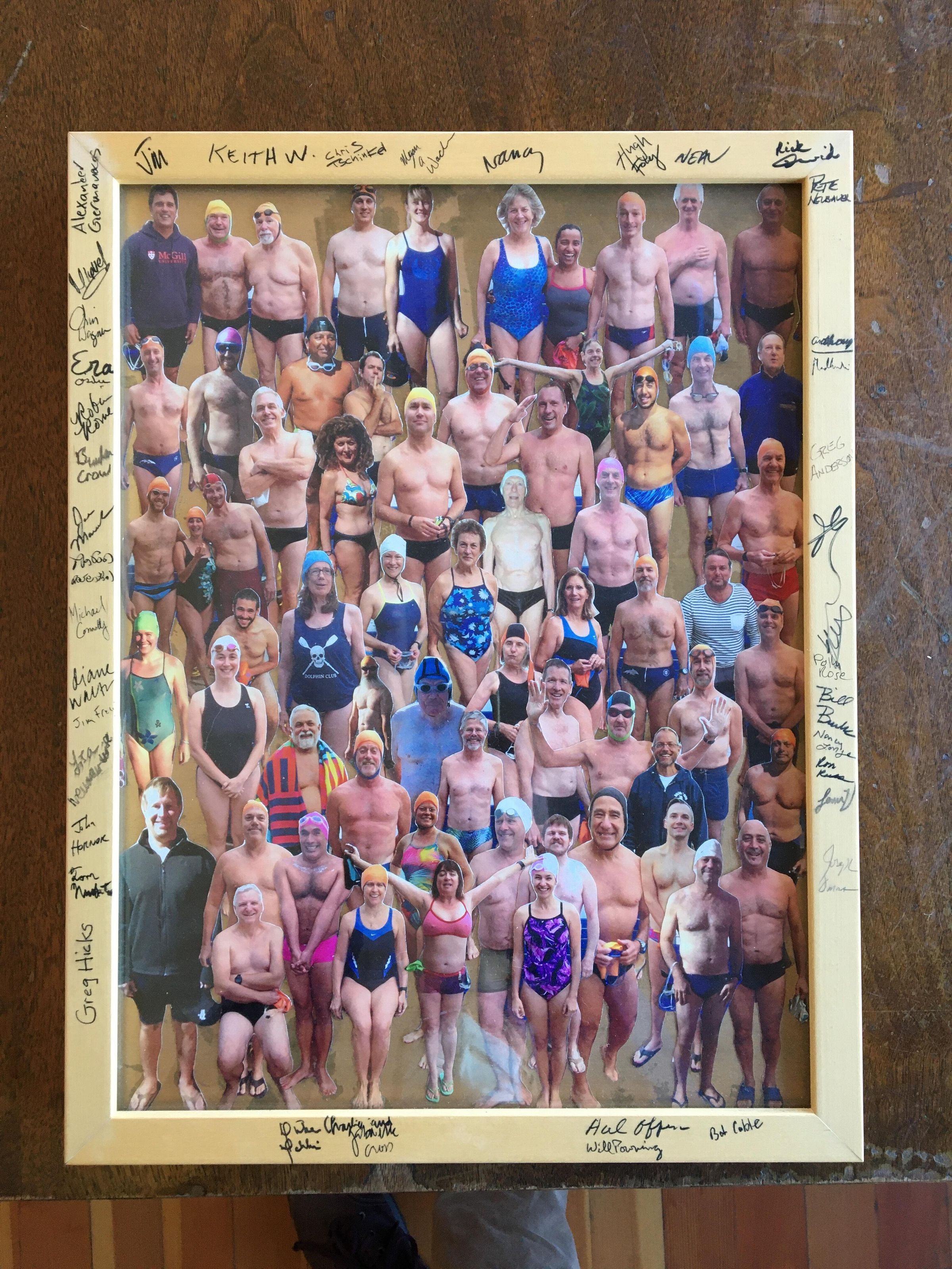 Duke Dahlin organized a Memorial Swim on September 3, 2016. Participants listed in attached PDF. Swimmers signed up for four different teams each in memory of a deceased member: Dan Osborne, Mariuccia Iaconi, Frank "Cecco" Menucci, and Jacqueline Powning. Total of approx 105 swimmers took part.